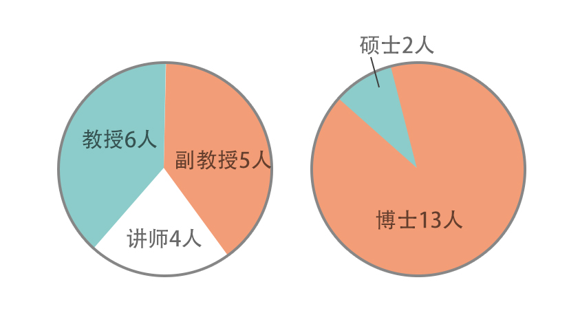 专任教师15位,约一半教师有海外留学经历。教授6人、副教授5人、讲师4人,13人具有博士学位,博士生导师5人,硕士生导师11人。教师队伍中,有教学名师1人,教坛新秀2人,安徽省学术技术带头人后备人选1人,有2人被学生选为“安徽师大最受欢迎教师”。
