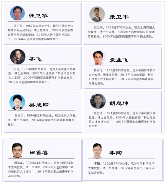 胡忠国,1997届本科毕业生。现任滁州中学副校长,正高级教师。安徽省教坛新星,全国中学物理青年教师比赛获一等奖。