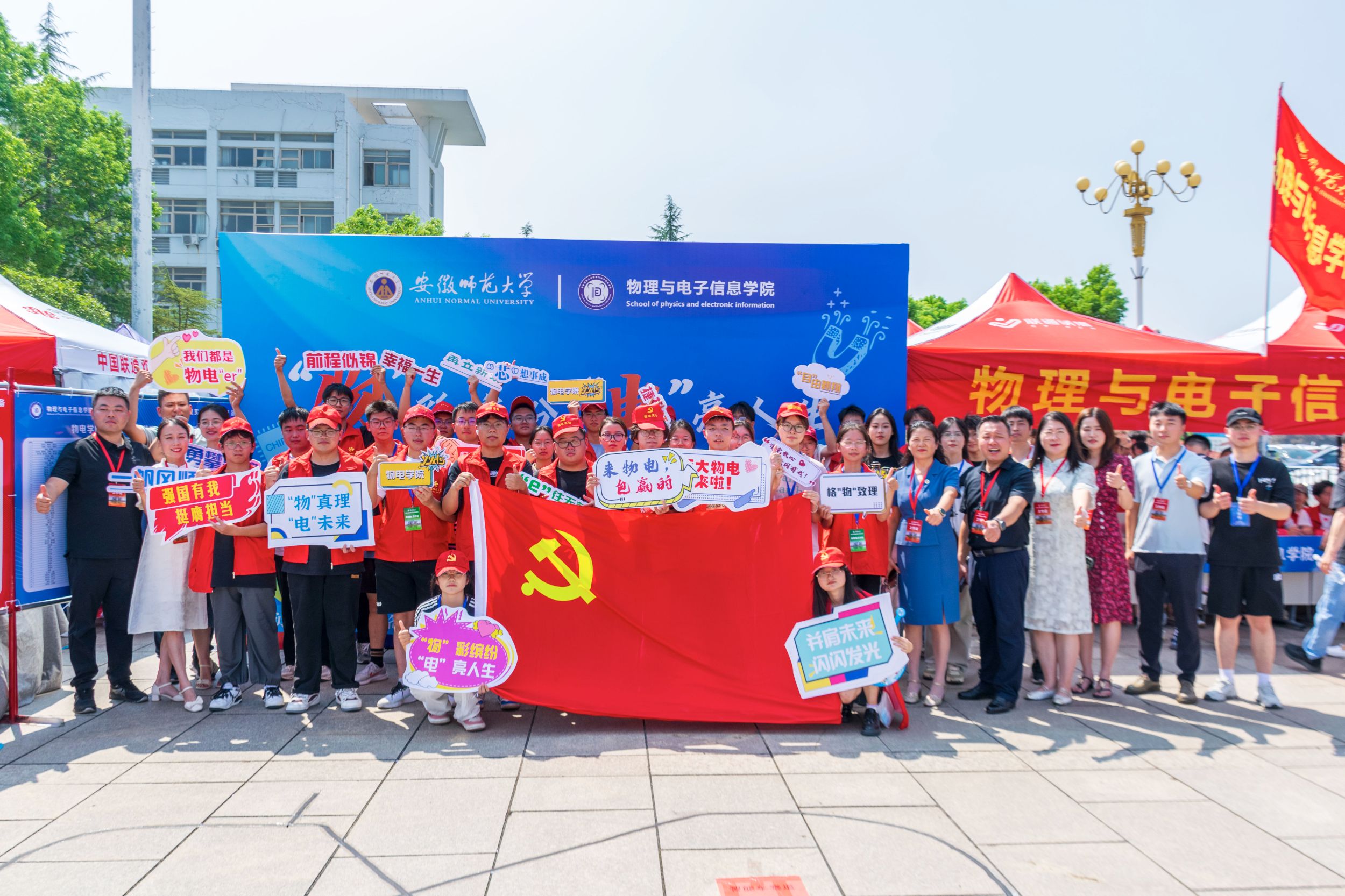 迎新现场,学术科技作品展台上展示着物电学子制作的科技作品,从工科学生研制的能歌善舞的机器人、风驰电掣的智能汽车、5G远程驾驶智能车到物理师范生自制的磁感应强度探究仪、法拉第电磁感应定律演示仪、光的折射探究仪等物理教具,通过学生志愿者专业演示与讲解,让新生们在展览中感受学科魅力,对自己所学专业有了进一步的认识。此外,学院学团组织简介、育人品牌项目、2024届考研光荣榜、学科竞赛光荣榜等宣传内容也在潜移默化中让专业思想教育加深加固。