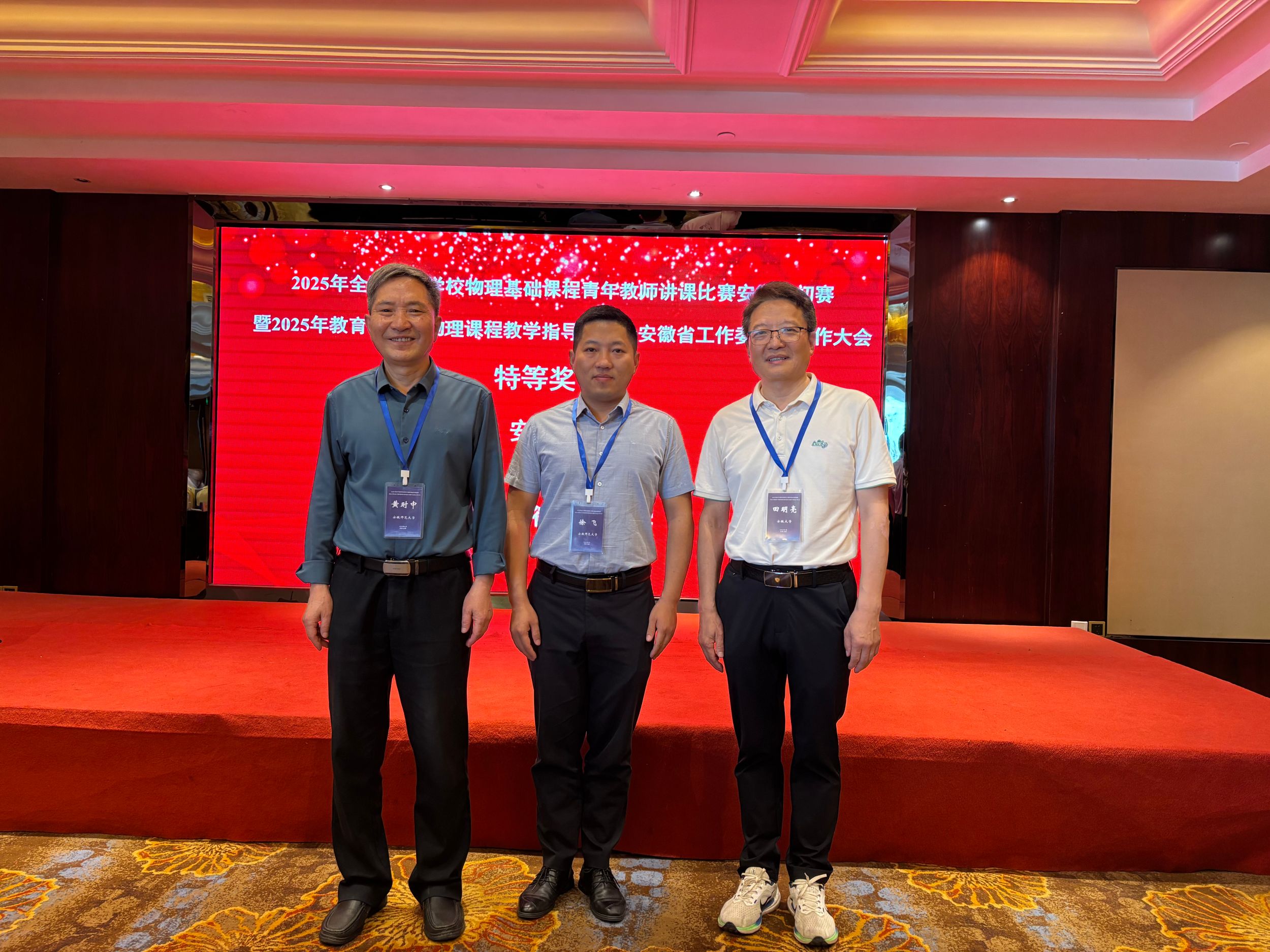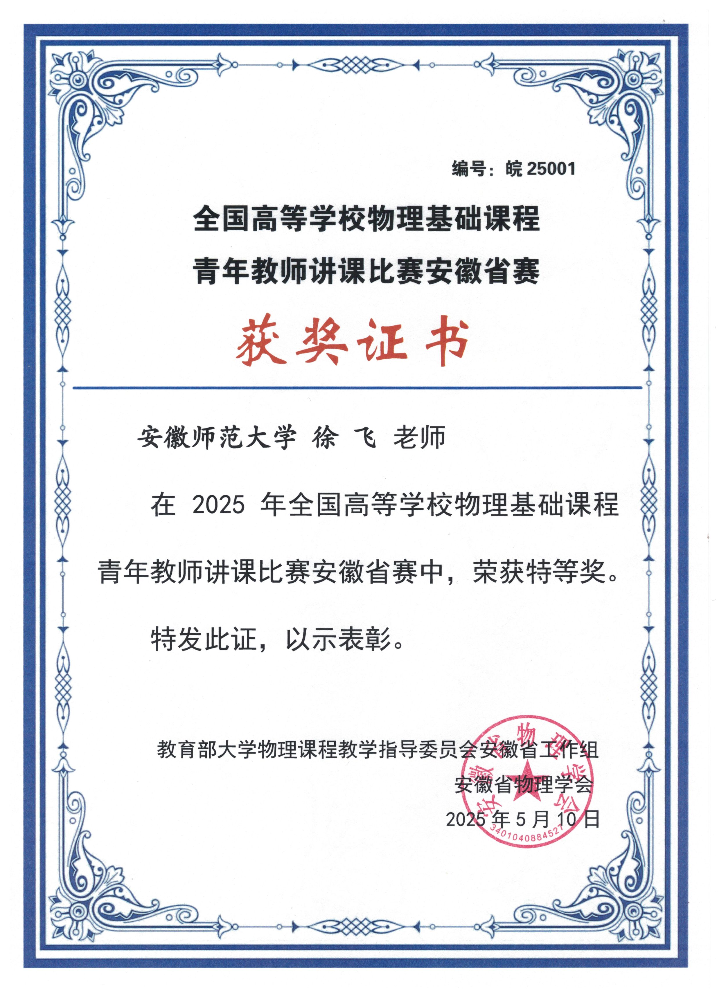 2025年5月8日-11日,全国高等学校物理基础课程青年教师讲课比赛安徽省赛在合肥市举行。我校必赢线路检测3003no1青年教师徐飞凭借出色的表现,荣获安徽省特等奖(第一名),将代表安徽省赛区参加于5月30日在福州大学举办的华东区比赛。