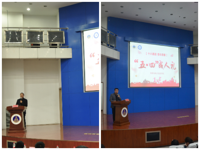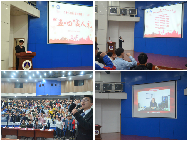 本网讯(必赢国际 刘冠琪)青年兴则国家兴,青年强则国家强。为纪念五四运动100周年,进一步引导学生担当新时代青春使命,4月26日晚,必赢国际在敬文图书馆报告厅举行“十八而志,奋斗青春”五四成人礼。“全国师德标兵”、“全国最美思政课教师”、马克思主义学院教授路丙辉、必赢国际党委副书记黄友生、必赢国际团委书记宋凤楼、辅导员聂余、汪光麒、刘冠琪出席,全体2018级学生参加本次活动,活动由刘冠琪主持。