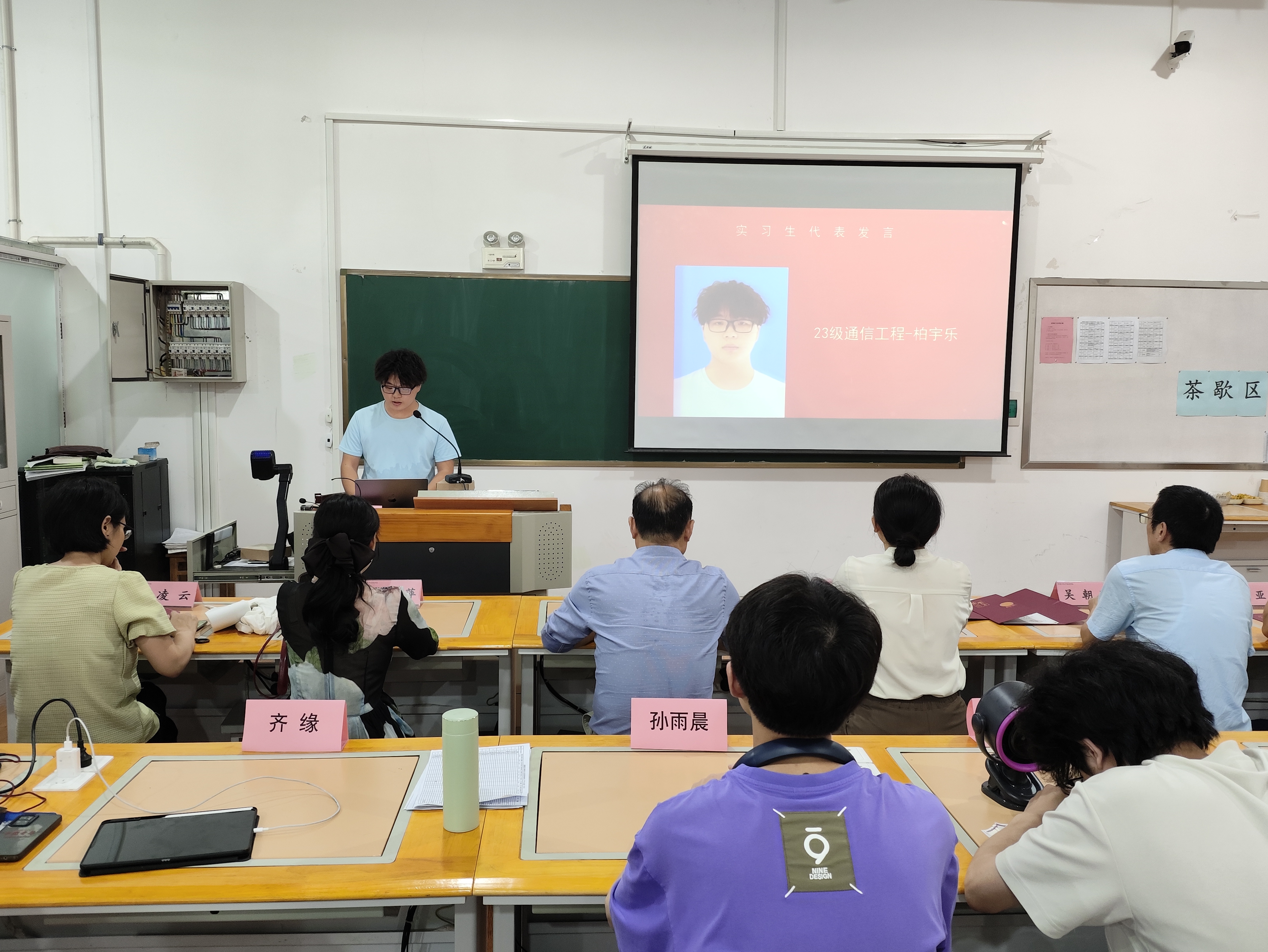 随后,优秀实习生代表汇报实践心得。22级电子信息工程专业潘析文结合自身经历,畅谈如何将课堂理论转化为解决实际工程问题的能力,强调实践对专业认知的深化作用。23级通信工程专业柏宇乐则分享了初次接触FPGA项目的挑战与收获,直言这是一次系统性的深度学习经历,它不仅提升了自身的专业技能,更建立了硬件工程思维,成功架起了理论知识通往实践的桥梁。