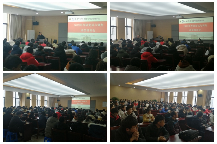 会上,郑贤锋从全国的考研形势、复试流程、专业知识、英语练习、面试技巧等方面向同学们做了细致的讲解。他勉励同学们把握一切机会,以积极向上的心态,沉着应战,打好研究生复试攻坚战。宁利新介绍了考研复试与调剂的政策与本院研究生相关专业招生计划,他还从考研面试心理调适、面试礼仪等方面对同学们进行指导。黄友生分专业通报了2019届本科生考研成绩基本情况,指出“道路千万条,考上第一条,现在不准备,复试两行泪”,希望全体同学备战要狠、视野要广、速度要快、脸皮要厚、心态要稳,积极行动起来,多方收集筛选信息,及时、主动的联系复试学校,做好万全的准备。