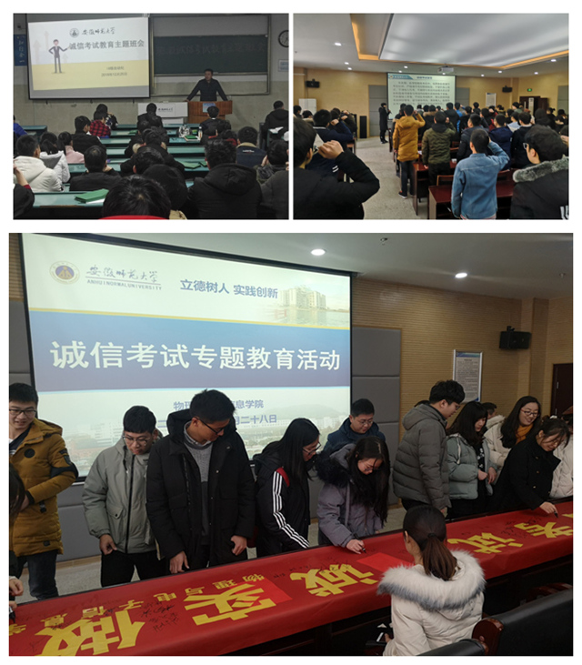 学院四个年级,五个专业,分别召开以“诚信考试”为主题的主题班会,学习《必赢线路检测3003考场规则》,并且举例说明学校对考试违纪或者考试作弊的处理方法,反复强调诚信考试的重要性以及作弊的严重性。学院全体院领导分专业到各班班会现场作动员讲话。同时,在辅导员的带领下,全体同学大声宣誓:“诚实做人,诚信迎考”,并且现场签订承诺书,用实际行动展现物电学子“严谨治学,诚信为人”的责任意识。