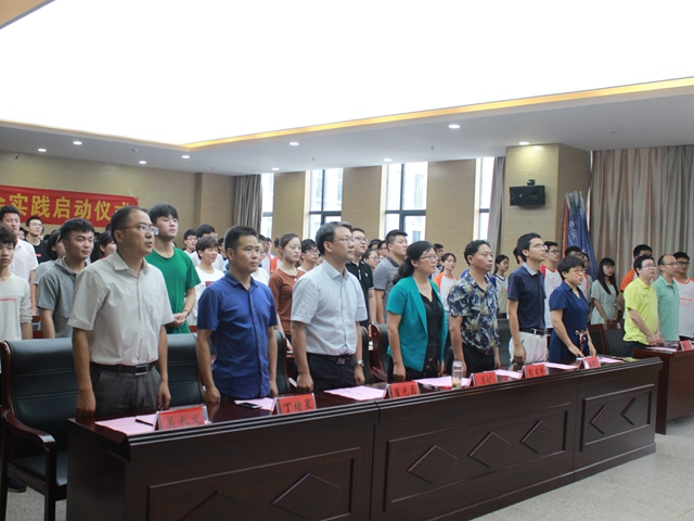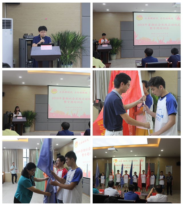 仪式上,2017年暑期社会实践优秀队员代表余亮分享了他的实践故事,作为理工科大学生,我们应该通过实践切实增强自己的动手能力,只有亲身体验才能收获真知。2018年暑期社会实践学生代表胡皖蓉代表全体实践队员庄严承诺,作为与新时代共同前进的新青年,一定会在实践中勤学、多思、力行,不断提高自身综合素质,在新时代书写青春华章,向社会发出师大好声音。思政指导老师李新从实践的目的方法、注意事项等方面对与会队员进行了指导。