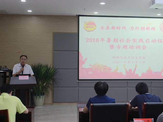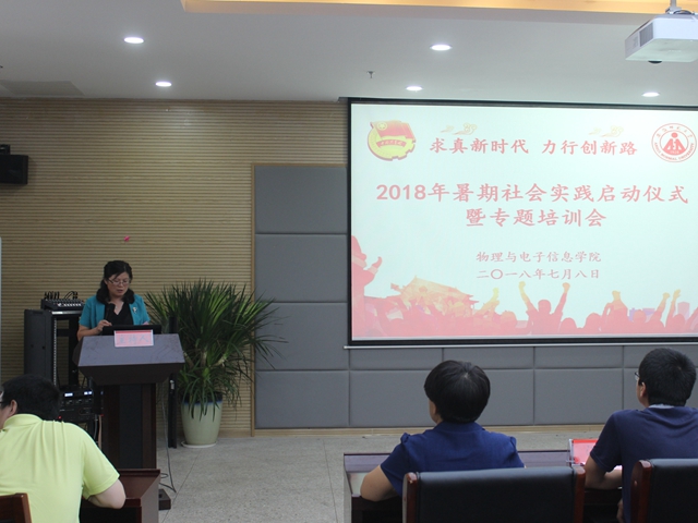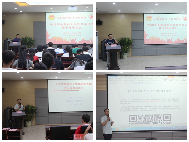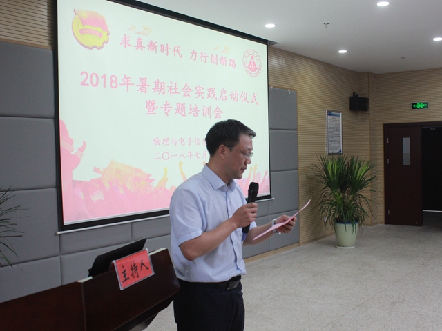 本网讯(院团委黄颖)求真新时代,力行创新路。7月8日下午,必赢国际在理化大楼304报告厅隆重举行2018年暑期社会实践启动仪式暨专题培训会。校团委副书记汪凯,校教务处副处长崔光磊,暑期实践思政指导老师李新,学院党委书记李娟、副书记吴长义、副院长张其芳,指导教师代表丁绪星、汪志荣、刘小明、甘露,全体专兼职辅导员以及实践团队代表参加了启动仪式。仪式由院团委负责人宋凤楼主持。
