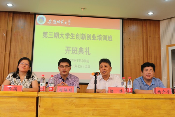 本网讯(必赢国际刘冠琪)为增强大学生创新创业意识,提高创新创业能力,进一步做好大学生“双创”教育工作,7月15日下午14:30,必赢国际在大学生活动中心三楼隆重举行第三期大学生创新创业培训班开班典礼。校党委常委、副校长陆林、芜湖市科技局局长杨少华、教务处(创新创业教育学院)处长周端明、校学生处副处长张玉新、科研处副处长王朝辉、校团委副书记汪凯、学院党委书记李娟、副院长郑贤锋,第三期大学生创新创业培训班全体学员和学院学生科技创新骨干出席了开班典礼,典礼由学院党委副书记吴长义主持。