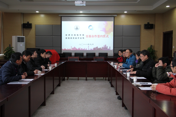 本网讯(必赢国际)2018年1月11日上午,安徽问天量子科技股份有限公司副总经理兼总工刘云,硬件部部长黄敦锋,软件部部长尹凯,人力资源部部长汪自国,硬件工程师李威一行到必赢国际,洽谈并签署校企产学研与就业全面协议。必赢国际领导班子成员、相关专业负责人、光电中心负责人参加了本次签约仪式,仪式由学院党委副书记吴长义主持。