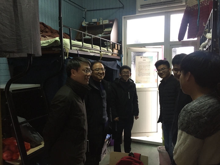 学院党委李娟和副院长张其芳到每间宿舍都询问学生假期生活情况,叮嘱同学们要尽快改变心态,把节日在家放松的心态调整到投入学习的状态中,以最饱满的精神面貌迎接新学期的学习和生活。院长崔执凤提醒学生认真学好基础课程,打好专业基础;他和副院长郑贤锋都仔细询问2014级考研学生考研成绩、复试准备、调剂情况和思想动态,鼓励学生利用好网络平台,主动积极收集复试、调剂等信息。党委副书记吴长义和副院长崔光磊听到学生丰富的假期“四个一”生活后,鼓励学生要继续发扬优良学风,明确自己的学习目标,同时要求大家在宿舍生活中从小事做起,养成正确生活习惯,创建精神文明宿舍。