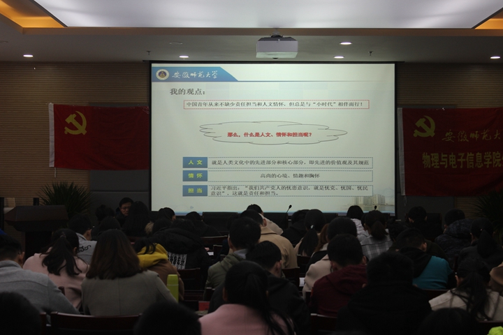 台启权分别从青年学子人文情怀的历史渊源、中国青年运动、当代青年的情怀、如何提升责任担当等四个方面阐述了时代骄子的人文情怀与责任担当。他指出:第一,青年学子的人文情怀具有深厚的历史渊源。他分析了儒、释、道文化的背景和差异,解读了仁义礼智信五常的含义,分享了范滂绝命等安徽名人文化故事,建议学生用“出世”的精神行“入世”的事业。第二,五四运动是中国青年运动的开端。他分析了五四运动的精神,问题和主义之争,并结合物理学的发展史,分析了实践的重要性。第三,当代青年要具备一定的人文情怀。他解读了永不知足的学习习惯、追求卓越的工作习惯、文明健康的生活习惯等“三个习惯”、提出了阅读、实践、创新的三大核心计划,指出要有心有大爱的家国情怀、言行文明的儒雅情怀、心有大爱的家国情怀、追求真善美的人文情怀。