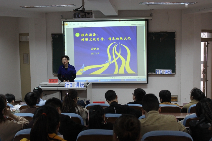 讲座伊始,俞晓红由设问“什么是传统文化”引入主题。她从“十一五”时期到党的十八大之后国家对优秀传统文化的相关文件要求、实际行动、理论研究等三个方面解读了相关文件精神。她结合网络报道分析了当前大学生语文水平现状,分析了增强文化传承意识的必要性和紧迫性。她指出借助文史类课程,力求呈现传统文化的精髓与核心价值,进一步展示中华民族心灵世界、文化性格与审美情趣,发掘经典文本中具有普世价值和现代意蕴的意义世界,为经典诵读教育提供优质文本。为帮助学生确立经典诵读文本,她重点解读了《论语》的“为学之道”与“仁学”,孟子的民本思想、仁孝观、良心说,老子的宇宙观、自然观、人生观,庄子的养身处世观、《诗经》的情感教育。她鼓励物电学子采用每日早读+每课留时、个人朗诵+集体诵读等基本方式学习,提倡并实施今音、 古调、 新唱多种方式相结合来增强文化传承意识,同时采取今音朗读、古调吟诵、古诗新韵等多种方式,拓宽经典诵读路径。她强调社会主义核心价值观的主要内容来至传统文化,而据世界教科文组织调查老子的《道德经》是西方社会第二畅销书,充分说明传统文化的作用与意义,希望同学们树立文化自信,传承传统优秀文化。