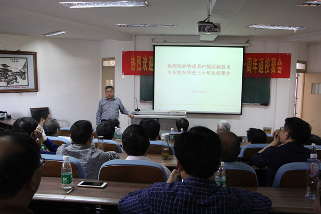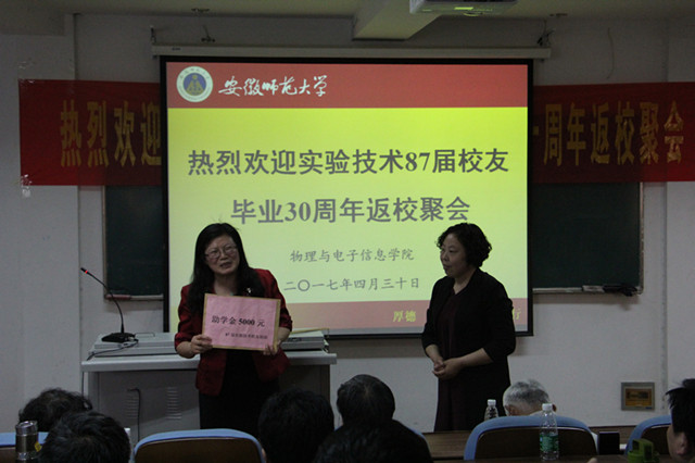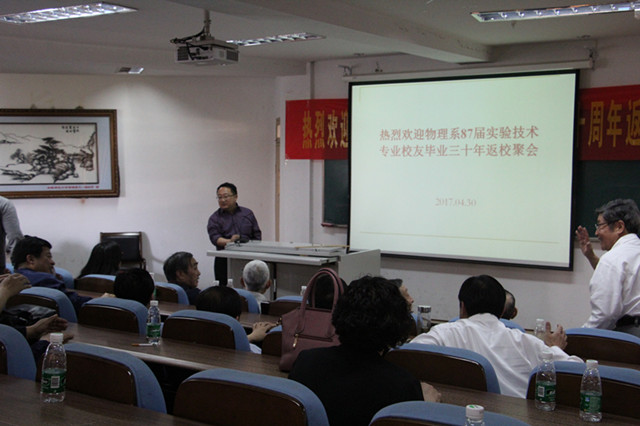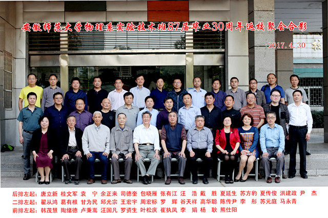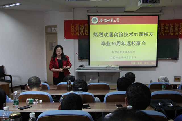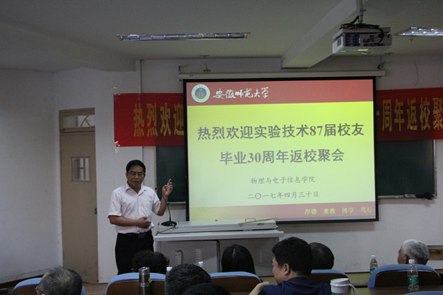 岁月如歌缅怀同窗往事,来日似锦珍惜师生情缘。4月30日下午,我院物理系实验技术专业87届校友毕业30周年返校座谈会在综合楼三楼大会议室举行。院党委书记李娟、院长崔执凤,教师代表陶绪德、卢秉嵩、汪国凡、罗资生、叶松庆、杨荣梅及返校的32名同学参加了此次会议,会议由87届校友、我校环境科学与工程学院行政副院长甘为民主持。