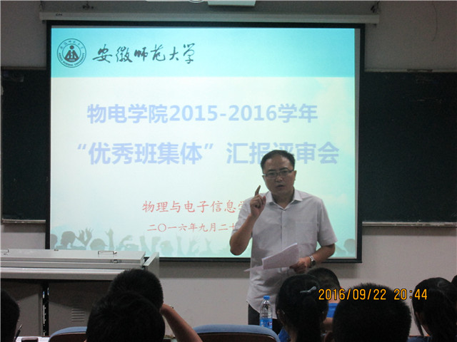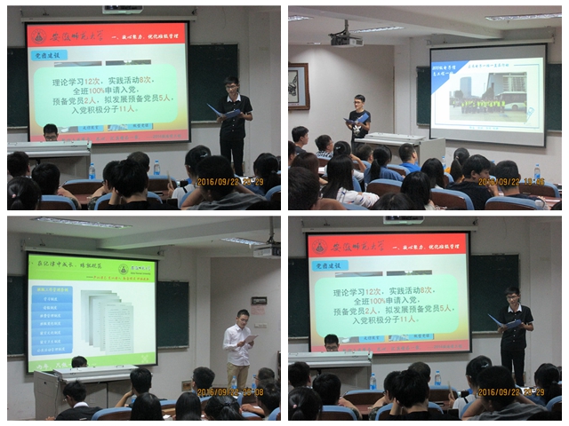 9月22晚,必赢国际2015-2016学年“优秀班集体”评审汇报会在在综合楼三楼报告举,院党委副书记吴长义、全体辅导员出席评审会并担任评委,各班级学生代表100余人观摩了现场汇报会。