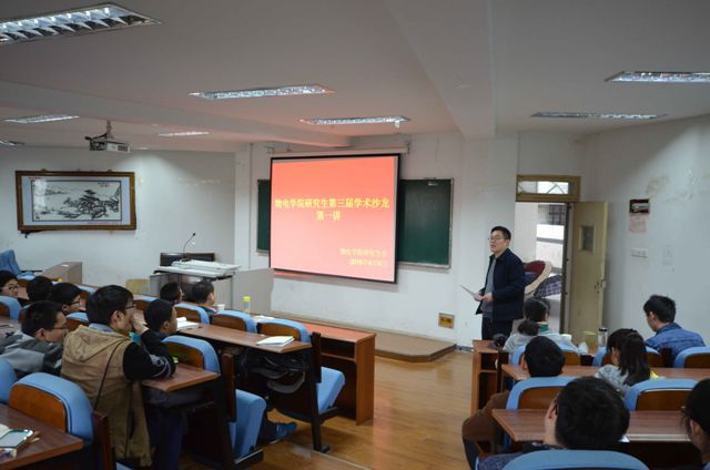 今天的第一讲学术沙龙以主报告人舒新文博士的《引力波物理和探测现状简介》开始。舒老师向与会介绍了引力波的形成原理、探测现状和发展前景,并告诉大家做科研的时候寻找行之有效的学习方法与思路尤为重要,之后大家就这个话题展开了热烈的讨论。后半部分是研究生的主讲环节,2014级研究生王辉同学做了题为《苯环单取代基衍生物的光谱研究》的报告,王兵兵和刘冲冲同学分别做了题为《基于线性化数据处理的位置指纹定位》和《光纤语音监听及基于新阈值函数和自适应阈值的小波包降噪》的报告,依次分享自己的研究成果和科研规划。