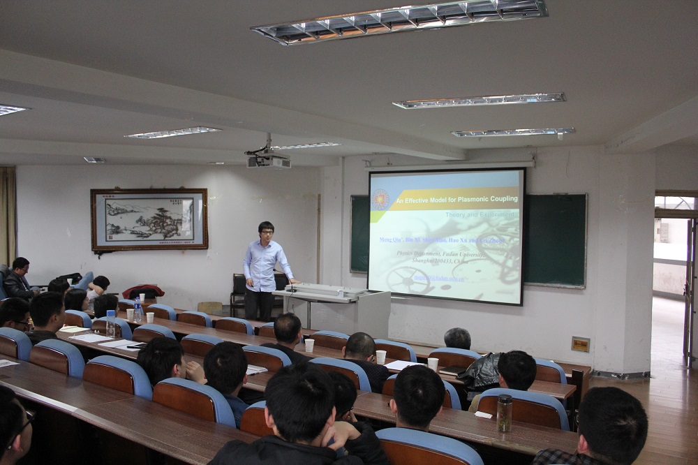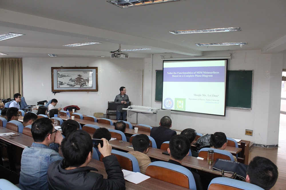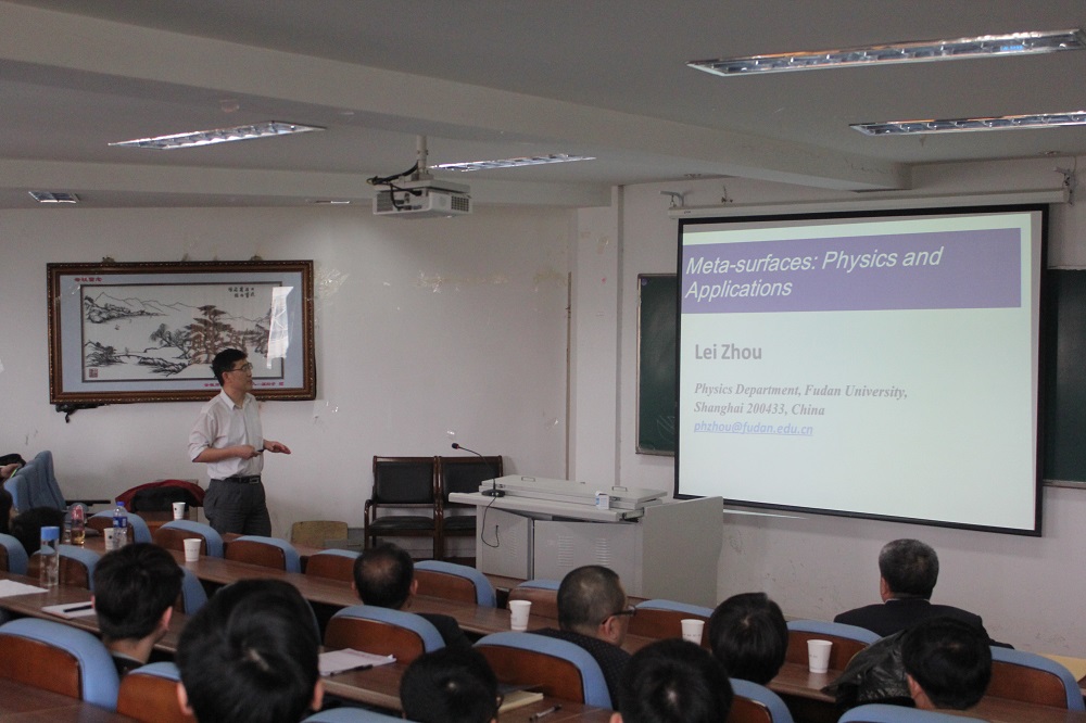 学术交流会由周磊教授的学术报告开始。周磊教授的报告题目为:“Metasurface:physics and application”,周教授从电磁波超材料的起源讲起,系统地介绍了超材料在近十年的发展与应用,并对超材料研究的关键问题:传播波与表面波耦合器的实现,以及可调超表面进行了细致的陈述。随后马少杰博士就周磊教授提出的电磁超表面相应问题的理论解释作出了详细叙述,最后邱孟博士运用通俗易懂的语言介绍了有效模理论的意义和应用。