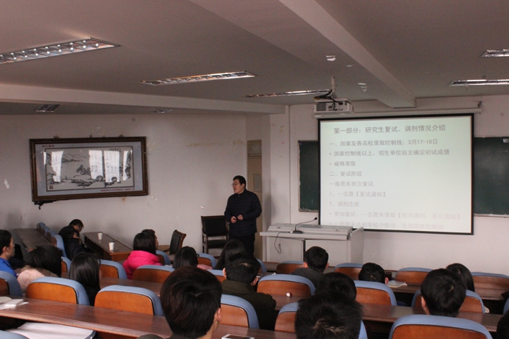 郑贤锋首先分析了国家及高校录取线的基本情况,对复试阶段的笔试、面试、心理测量等方面逐一做了介绍。他重点对复试的内容进行了分析,他提醒广大考生复试前可以多搜集一些报考专业的前沿动态、目标院校相关导师的论文,同时准备时要广泛涉猎,拓宽知识面,不可固守教材。对于调剂,郑贤锋提醒广大学生应认真复习,主动了解调剂信息,提升调剂成功的概率。会上,郑贤锋介绍了本院硕士点的发展历史、学科平台情况、导师队伍、研究生招生与培养方式,强调了调剂复试过程中的注意事项、复试科目与调剂要求,鼓励同学们珍惜前期考研努力的成果,积极调剂回学院,实现自己梦想。