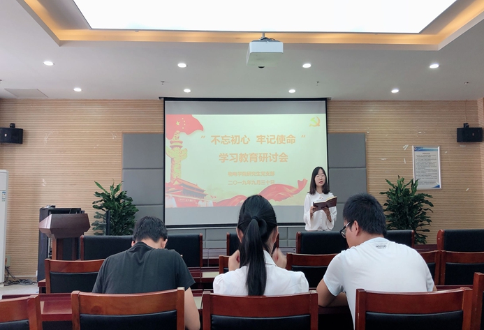 “快闪”活动结束后,研究生党员在物理楼304会议室召开“不忘初心、牢记使命”学习研讨会。2017级研究生党支部书记吴广成领学了《习近平在中央政治局第十五次集体学习时强调:全党必须始终不忘初心牢记使命,在新时代把党的自我革命推向深入》,研究生各支部委员结合自己的专业、生活和学习做了研讨发言。