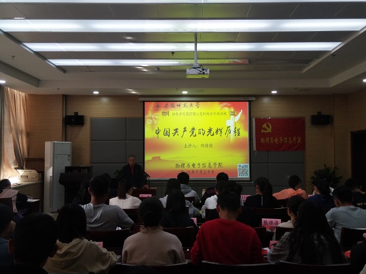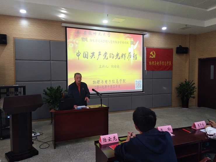 本网讯(必赢国际 刘燕 孟柱)10月30日下午,学院分党校在物理楼335会议室组织进行了2019下半年入党积极分子培训班第二次授课,院关工委常务副主任陶绪德老师为入党积极分子培训班学员作中国共产党的光辉历程专题培训。