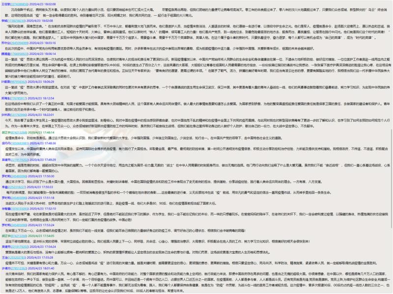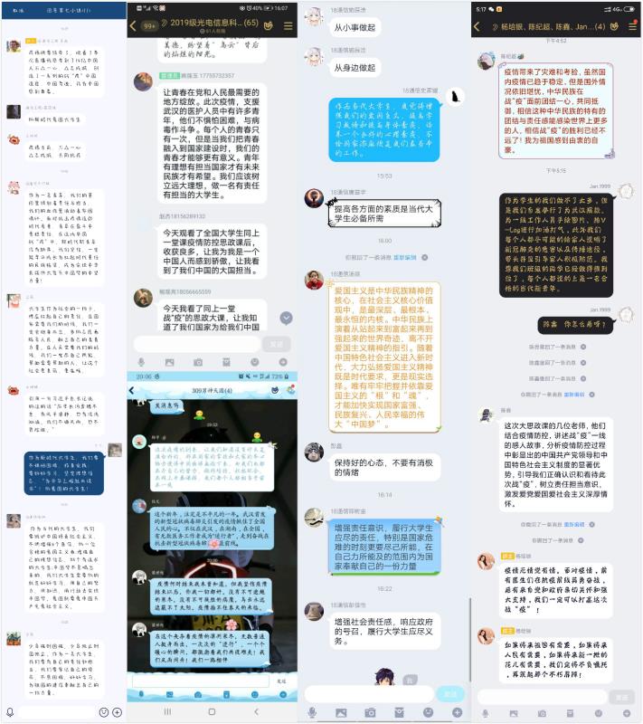 线上研讨强化担当。这堂战“疫”思政大课在全院师生中产生热烈反响,课程直播结束后学院积极引导师生进行线上研讨。辅导员们谈到,“当前疫情防控取得积极良好成效,全国大中小学陆续开展返校工作,在这样的时刻深入学习了一堂战“役”思政大课,进一步坚定了战胜疫情的信心,增强了听党话、跟党走的情感认同,同时强化了作为青年学子的使命担当,为未来的学习生活指明了方向。高校辅导员要将高校思想政治理论课教学优势转化为支持防疫斗争的强大力量,引导广大学生树立正确的世界观、人生观、价值观,将个人成长成才的梦想融入到中华民族伟大复兴的中国梦中,与学生共担使命,共同成长。”2017级自动化专业魏潘晨说到:“一张张留下医疗护具深深痕迹的脸庞让我感动,一份份按满红指印的请战书让我震撼,在这场没有硝烟的战争中他们为青年人树立了良好的榜样,向我们展现了当代青年的责任和担当。在赋予了朝气、活力、拼搏的美好青年时期,我们应当有凌云壮志的想,更要有脚踏实地的行,我相信当我们这一代手握中华民族伟大复兴的接力棒时定能担当时代的重任,砥砺前行。”2019级电子信息类霍雅娜说:“ 白衣战士的逆行,让我们看到了无数平凡而伟大的身影。在疫情防控期间,泪水,悲伤,感动,温暖,坚强,执着,拼搏,担当,无畏,英勇,这些情感记忆,都将成为我们共同的烙印。而现在,终于迎来春暖花开,沧海横流显砥柱,万山磅礴看主峰。我终于深切体会到了‘哪有什么岁月静好,只是因为有人替我们负重前行’这句话最真实的意义。唯有将青春岁月与祖国人民相连,求真力行,勇于担当,才能书写‘大写’的人生篇章!”