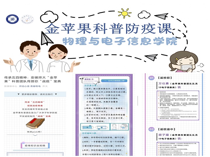 助力防疫勇担当。5月2日,学院金苹果科普团队在微信、微博、官方QQ等新媒体平台同步推出《金苹果科普“战疫”宝典》。本次专题科普课程从新冠病毒、日常防护、返校注意事项等内容多角度、全方位地进行防疫知识科普,助力广大学子科学防疫、平安返校。