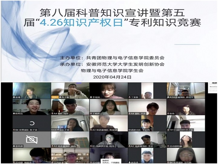 科普竞赛促学习。4月26日,学院举办第五届“4.26知识产权日”专利知识线上竞赛,442名学生参加初赛答题,8支队伍成功晋级决赛。抢答环节中,每组四个队伍进行抢答,内容涵盖知识产权保护、青少年科普等。宣讲环节,各队伍以抽签顺序分为A、B组,分别就疫情防控和科学发展两大主题开展宣讲。队员们赛前充分准备、分工合理,展现出扎实的知识储备和积极向上的青年风貌。