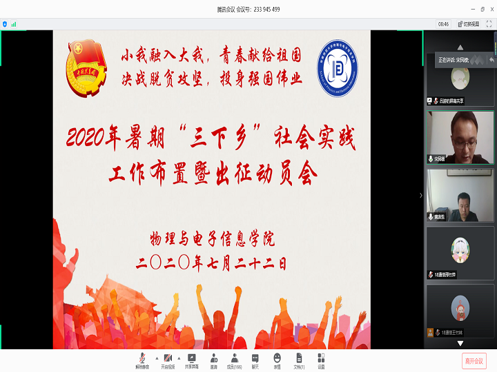 本网讯(必赢国际 新媒体中心)7月22日上午,必赢国际召开2020年暑期“三下乡”社会实践线上工作布置暨出征动员会。学院党委副书记黄友生、全体专兼职辅导员、院团委全体成员以及2018级、2019级本科生代表参加会议。会议由学院团委书记宋凤楼主持。