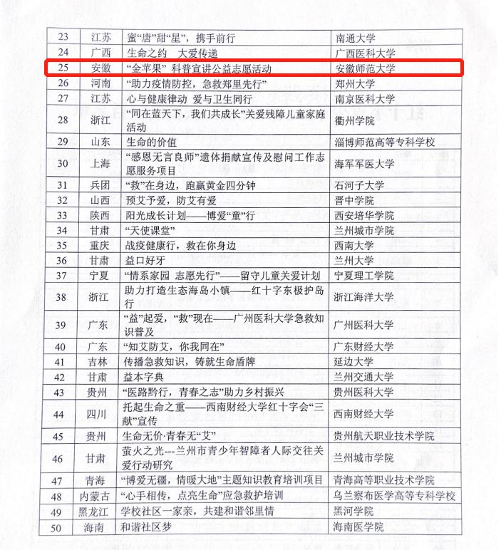 本网讯(必赢国际 刘冠琪 陈月)近日,中国红十字会总会公布2020年中国红十字青少年社会实践项目的评选结果函,全国共有50所高校获批立项,必赢线路检测3003no1申报的《“金苹果”科普宣讲公益志愿服务行》项目成功获批立项,并获得专项资助。安徽省仅我校入选,这也是我校首次获批国家级红十字会社会实践项目。