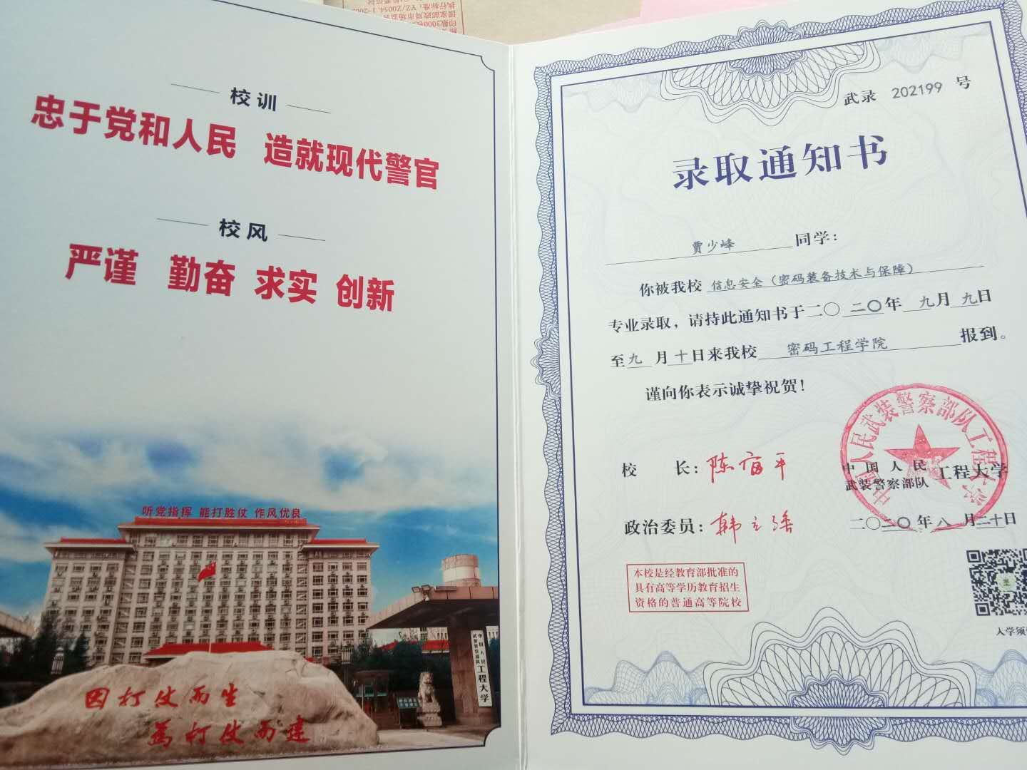 2020年即将退伍的他,为了进一步提高自己的军事素质,更好地报效国家,再次坚定决心,报考军校。在训练或执勤结束后,他利用空闲时间争分夺秒看书学习。功夫不负有心人,最终于8月以全省第二的成绩拿到武警工程大学的录取通知书。