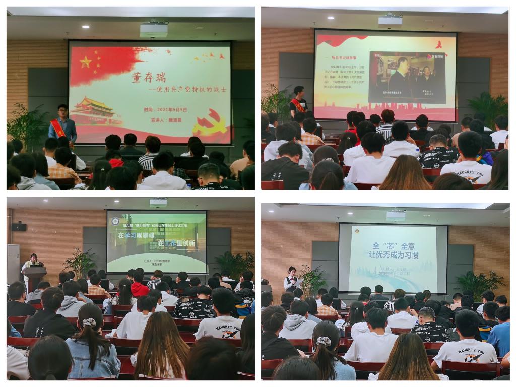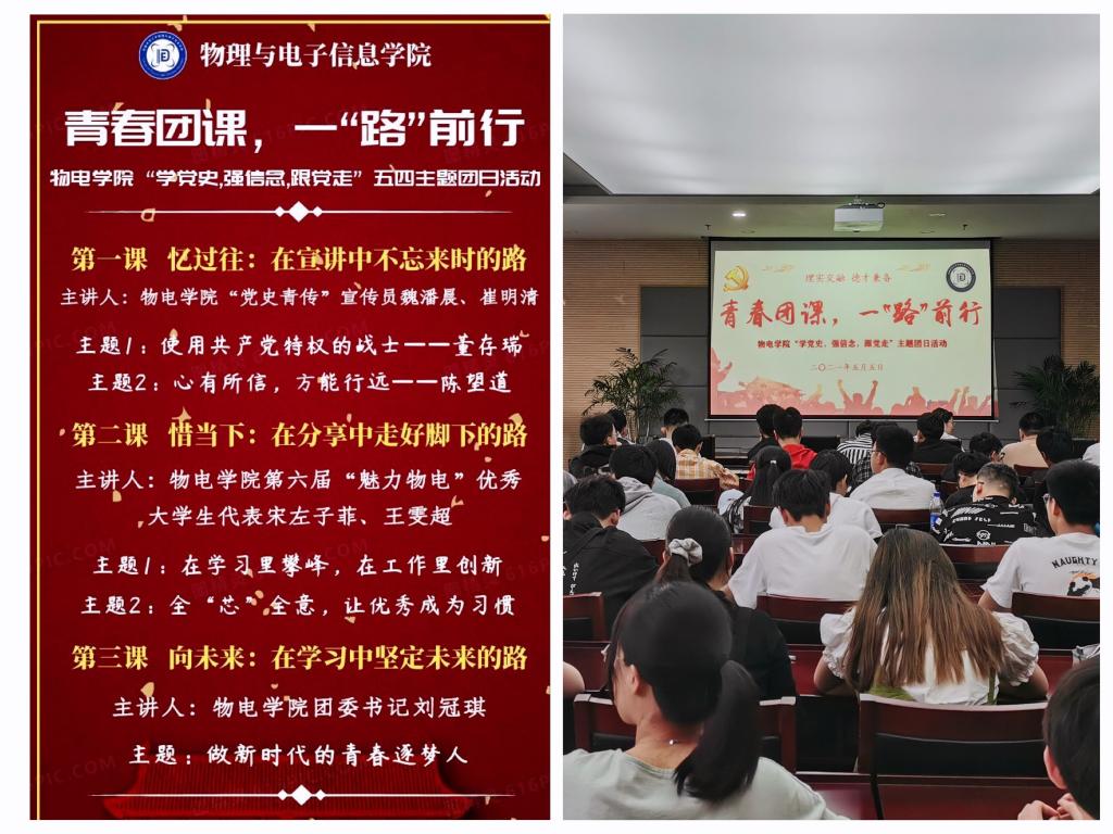 微团课分三部分进行。第一课《忆过往:在宣讲中不忘来时的路》,由学院“党史青传”宣传员魏潘晨、崔明清展开,他们用最真切、美好的青年之声向我们分享了他们心中的英雄董存瑞、陈望道。第二课《惜当下:在分享中走好脚下的路》,由学院第六届“魅力物电”优秀大学生代表宋左子菲、王雯超现身说法的讲述她们大学的成长与蜕变,展现出把热爱做到极致的青春本色。第三课《向未来:在学习中坚定未来的路》,由刘冠琪讲述“立心、力行”做新时代的青春逐梦人,在美好韶华中做不忘初心的奋斗者。每场微团课之间,五四主题视频、朗诵《可爱的中国》节选等,进一步激发青年学子爱国爱党热情。