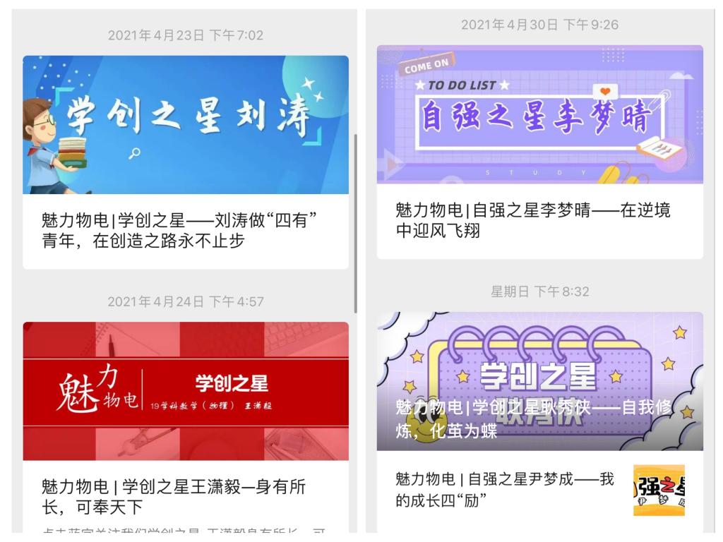 五四”前夕,学院团委推出物电“星”榜样网上系列报道,用文字和图片展现物电学生中的典型事迹和奋斗故事,提高线上主题团日活动针对性和亲和力。