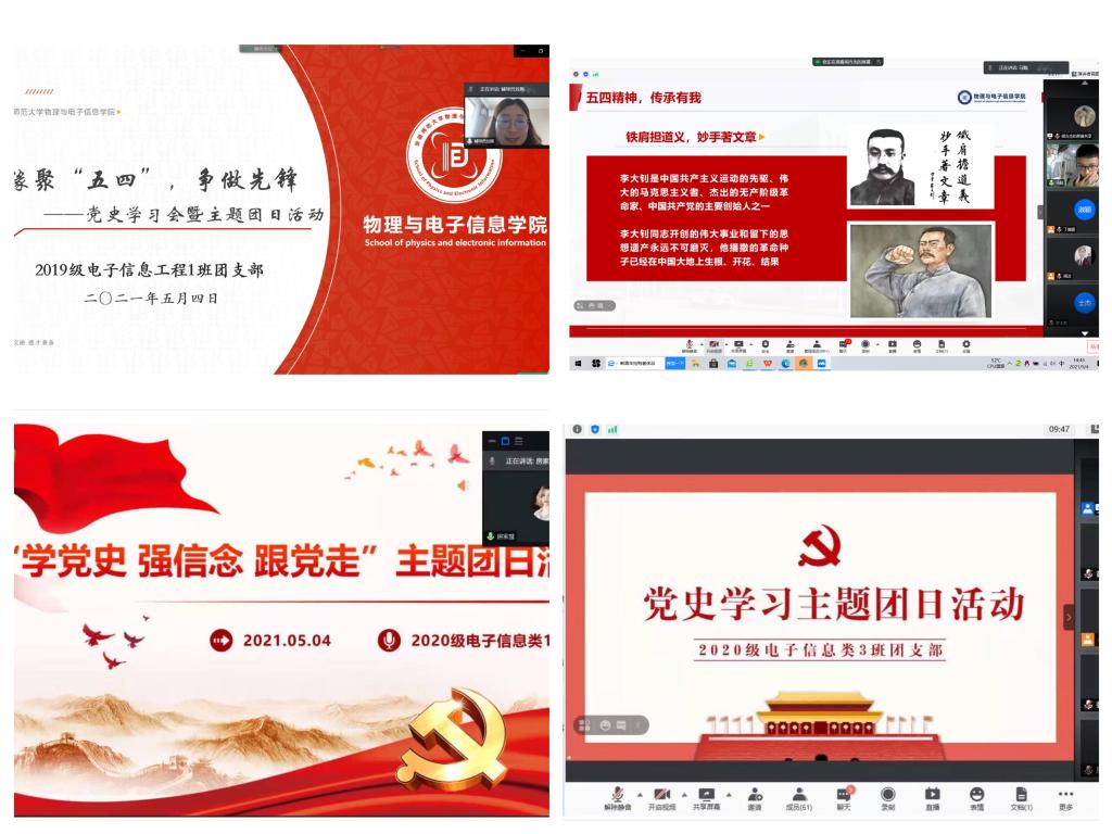 5月4日,必赢国际各团支部通过学习座谈、宣讲交流、故事分享、心得体会等方式,积极开展党史学习教育会暨主题团日活动。2019级电子信息工程专业以《缘聚“五四”,争做先锋》为主题,以学习新思想、争做新青年,五四精神、传承有我,生逢盛世、肩负重任三个篇章,从观看短片到领学习近平总书记视察清华大学的重要讲话精神,从青马工程”培训班学员分享五四青年故事到结合“学党史,强信念,跟党走”主题云团课分享自己的感悟,让一场团日活动走深走实。2020级电子信息类1班则以“云”团课《传承红色基因 做时代新青年》、“云”宣讲《传承五四精神 凝聚青春力量》等形式强化党史学习教育。