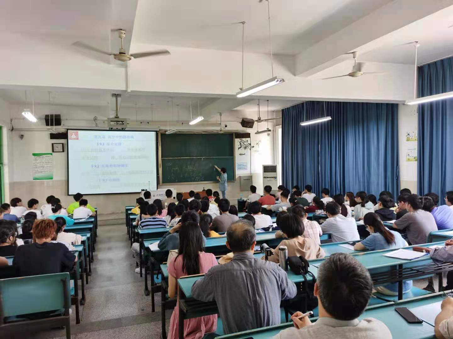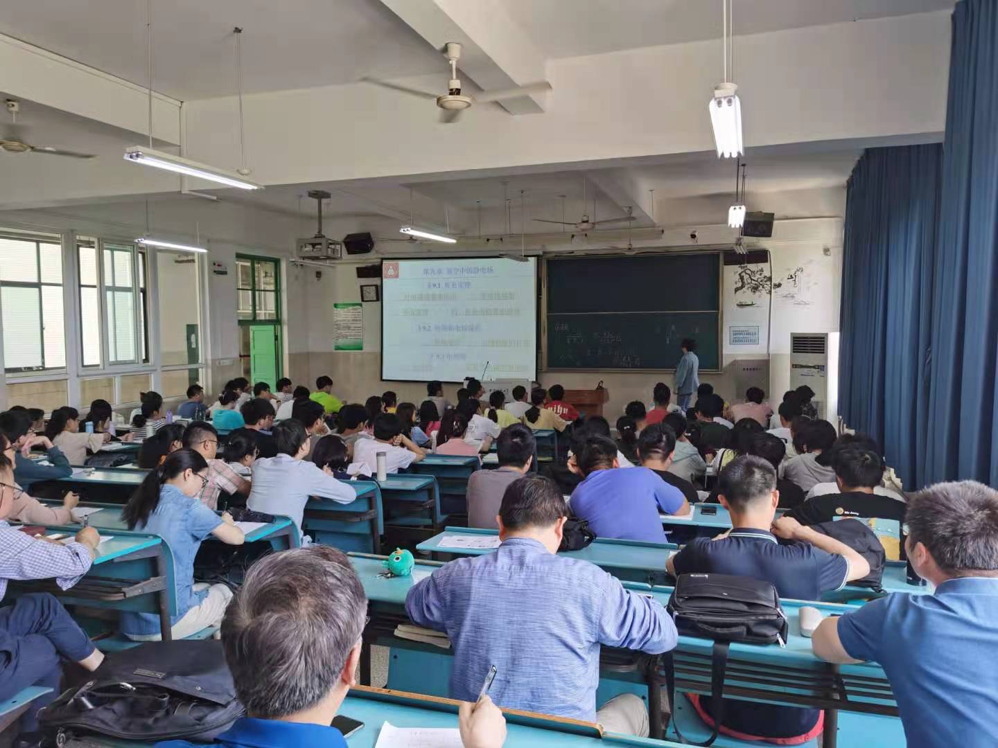 本次授课内容为“真空中的静电场”,涉及“库仑定律”、“电场与电场强度”、“电场线”、“静电场与高斯定理”、“静电场的电势能和电势”等众多知识点和物理概念。黄武英老师凭借深厚的教学功底和丰富的教学经验将众多知识点与抽象的物理概念进行串联,衔接自然、条理清晰、讲解透彻。授课过程中,黄老师通过大量精心设计的提问与设问不断引导和启发学生进行深入思考,层层展开、循循善诱,大到每一次走位、每一步落脚,小到每一个眼神、每一处停顿,都恰到好处、无比精准,轻松解决了大班教学中的走位和吸引学生注意力的问题,举手投足间尽显教学之美。