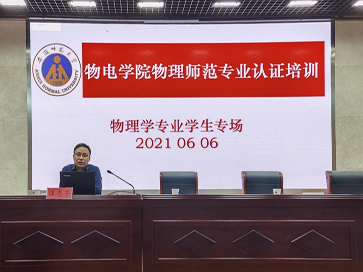 接着,汪志荣老师作认证培训。汪老师介绍了物理学(师范)专业人才培养方案的修订缘起,分析了师范教育的新形势及其对一流本科、一流专业的发展趋向,强调专业认证对本科专业建设与发展的重要意义。汪老师从对师范专业认证的认识、物理师范专业培养目标设定、毕业要求、课程与教学等四个方面展开培训,就专业认证的理念及二级认证体系作了详细的解读。