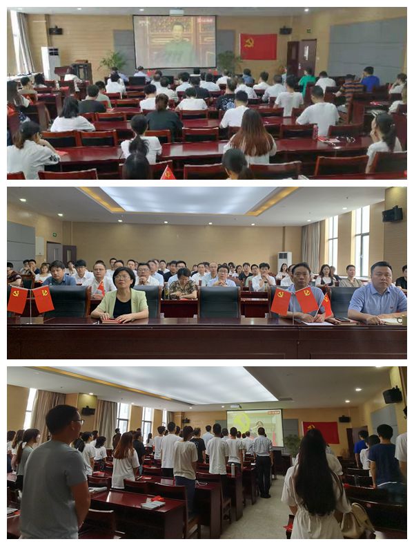 会场观众手握一面面鲜红的党旗,认真聆听习近平总书记重要讲话。观看庆祝大会后,学院党委举办了颁奖仪式,颁奖仪式由院长郑贤锋主持。