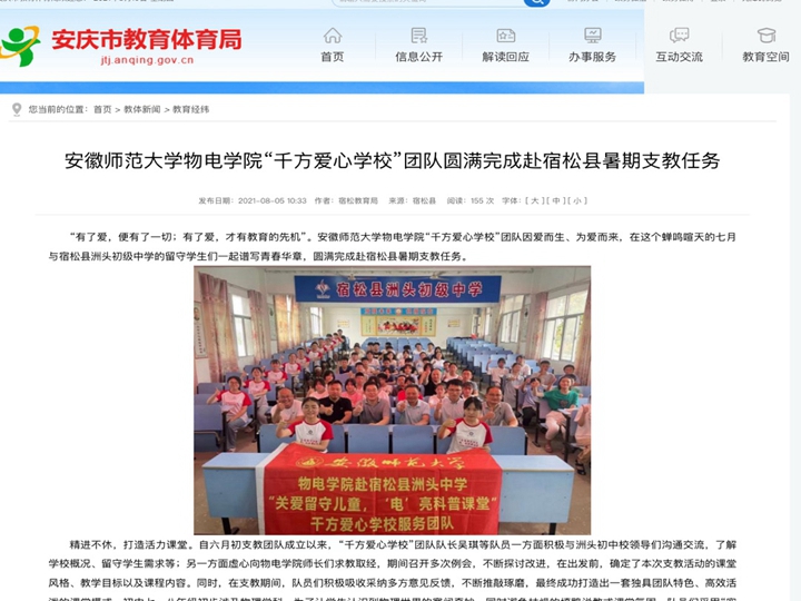 【2021青春三下乡】安庆市教育体育局官网报道我院暑期社会实践团队工作