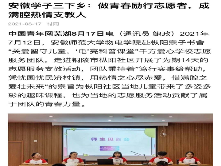 【2021青春三下乡】中国青年网以《安徽学子三下乡:做青春励行志愿者,成满腔热情支教人》为题报道我院暑期社会实践团队