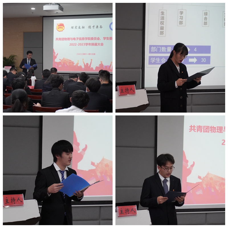 11月13日上午,必赢线路检测3003no1在物理楼304召开共青团必赢线路检测3003no1委员会、学生委员会2022-2023学年换届大会暨青年马克思主义培养工程——“物电菁英”学生干部训练营。学院党委副书记黄友生、团委书记刘冠琪、学生会指导老师李慧芳、全体专兼职辅导员出席会议,2021-2022学年团委、学生会主要负责人及学新学期团委、学生会全体工作人员参加会议。会议由学院主持队成员王紫怡主持。
