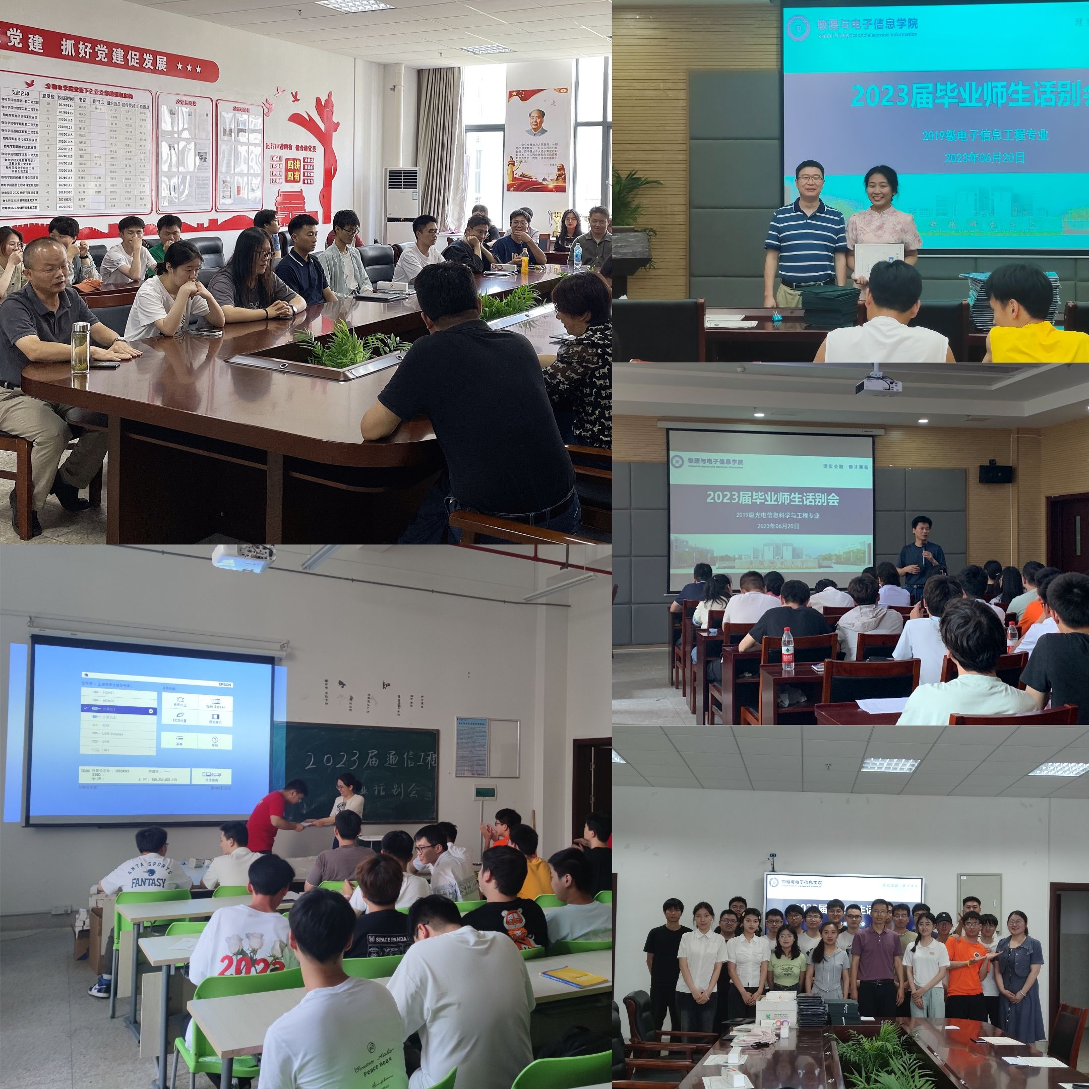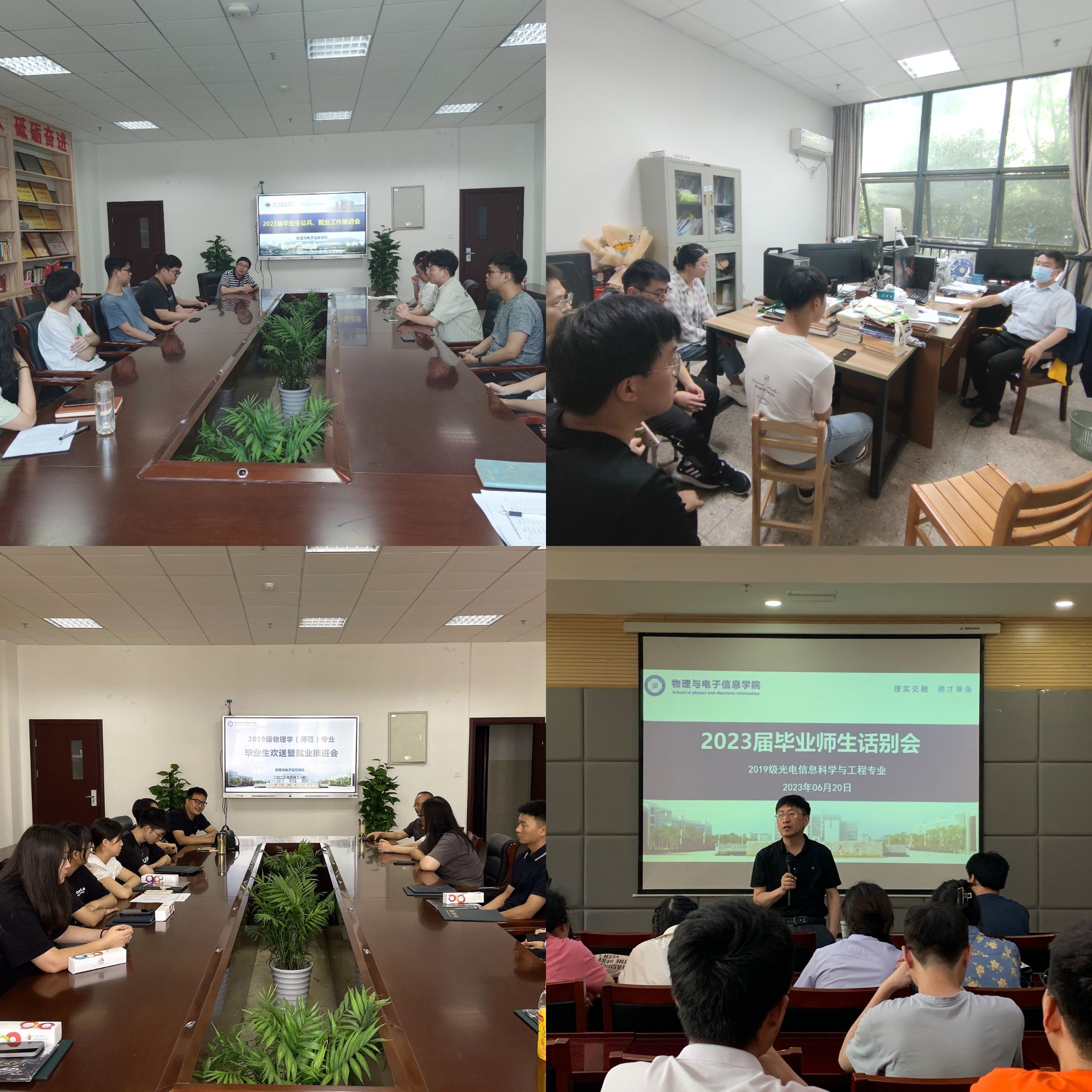 一场班会说不尽四年时光,6月12日-20日,2023届毕业班分别组织开展最后一次主题班会,专业老师与同学们共聚一堂,回顾大学以来的点滴生活;一场座谈讲不完成长进步。6月14日下午,学院在在物理楼308会议室召开2023届毕业班学生骨干座谈会,同学们畅谈自己的成长与进步,与会老师们回顾了与团学骨干之间诸多难忘的记忆,表达了对学生干部的出色表现和辛勤付出的感谢;一场话别装不下浓浓真情,6月20日下午,学院召开毕业生分专业师生座谈欢送会,院领导、专业教师为毕业生颁发“双证”,与毕业生回顾大学生活,送去临别祝福。