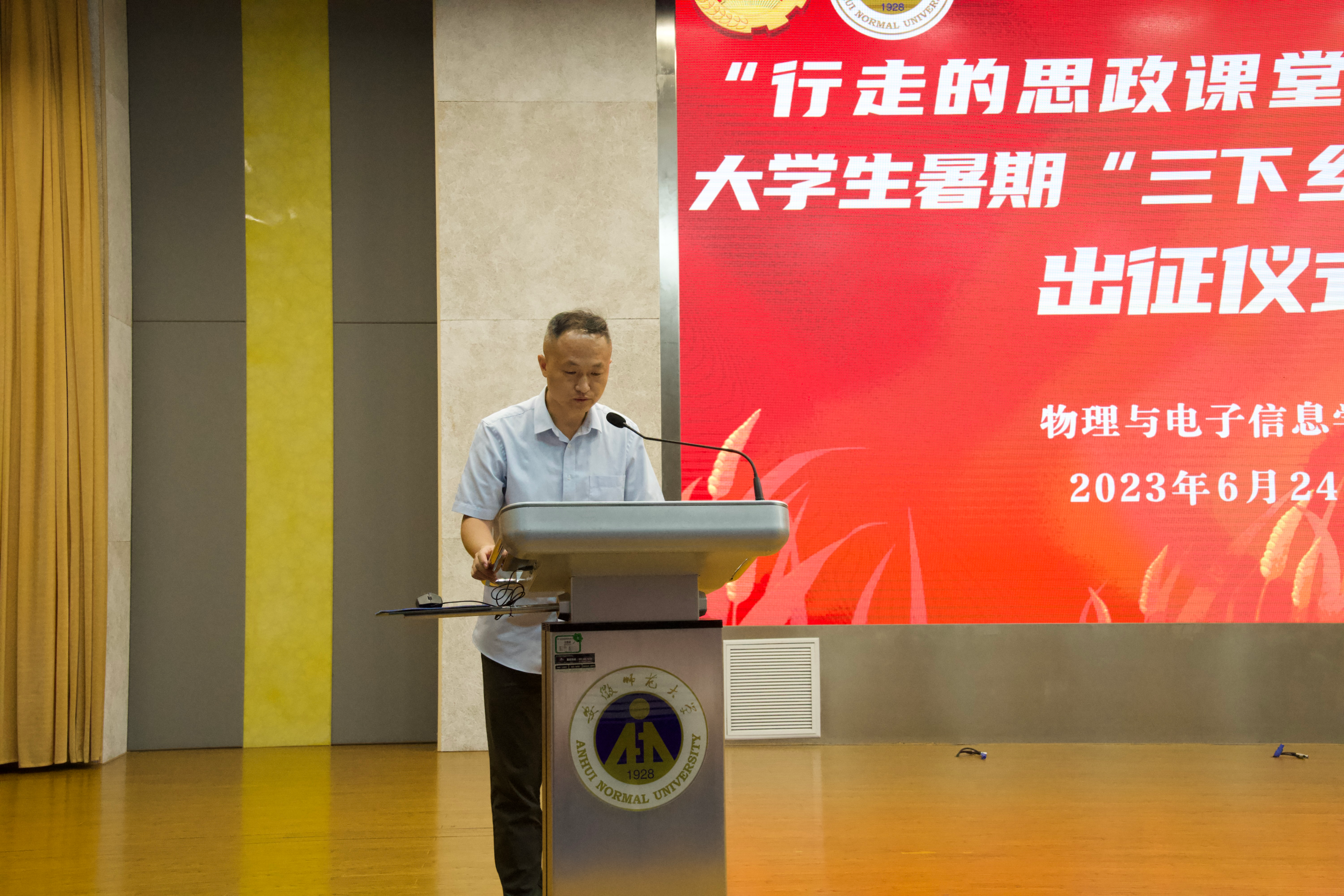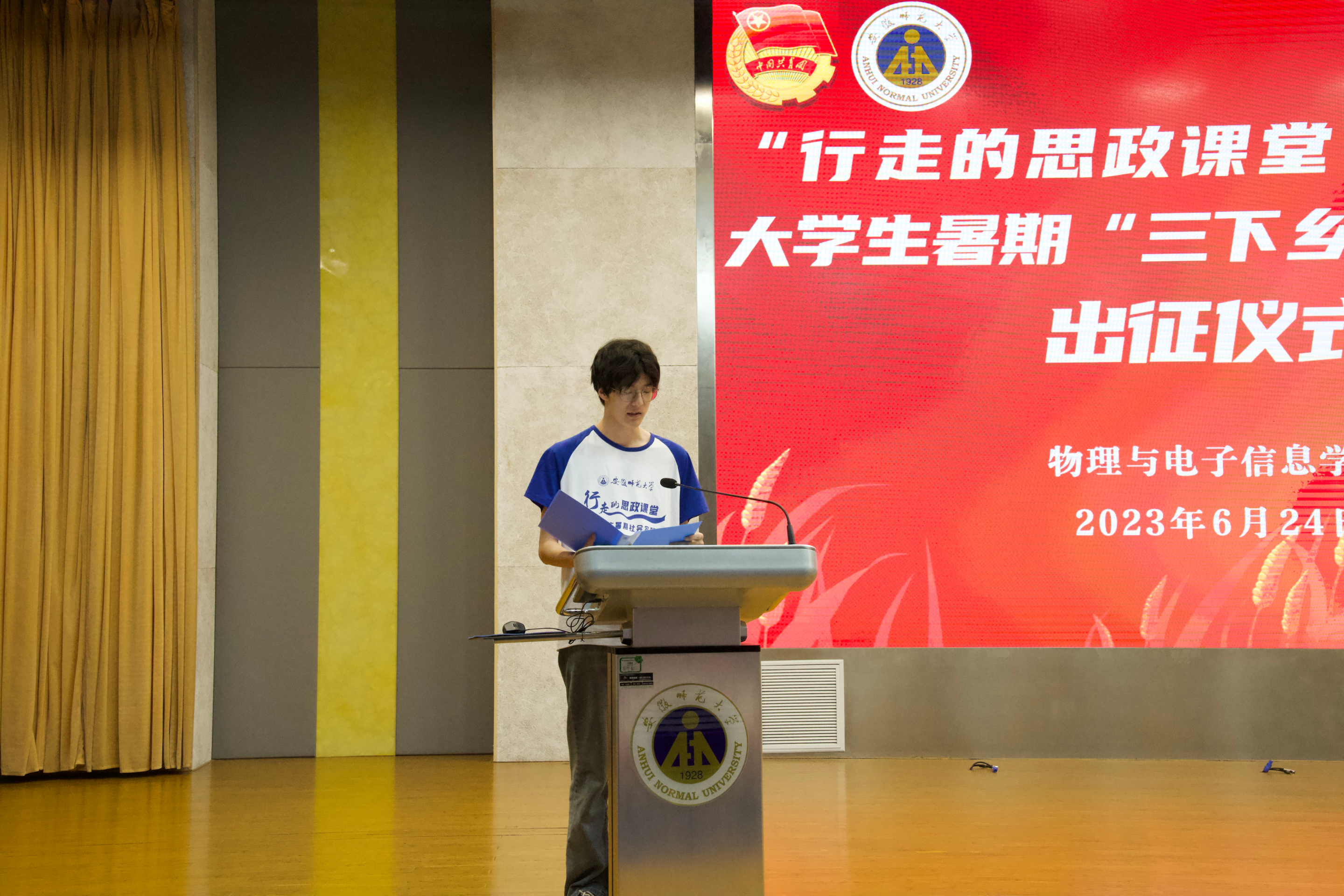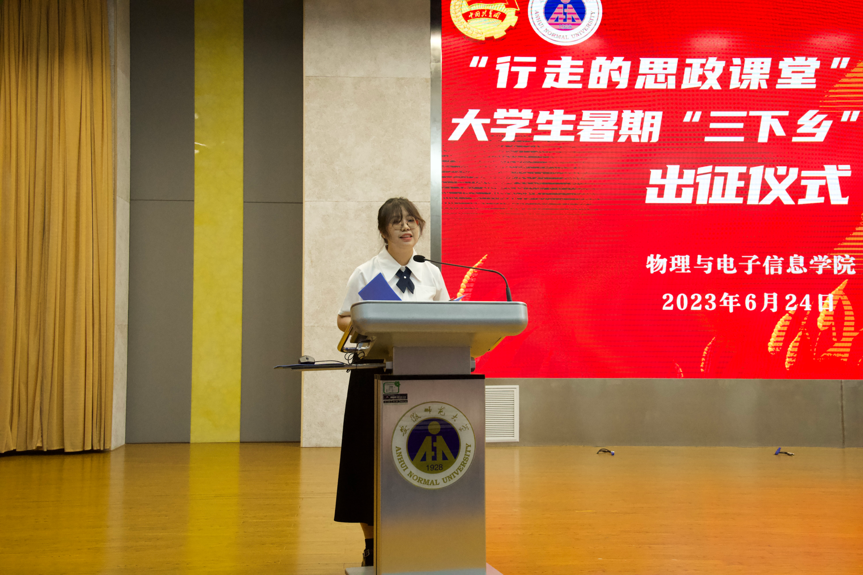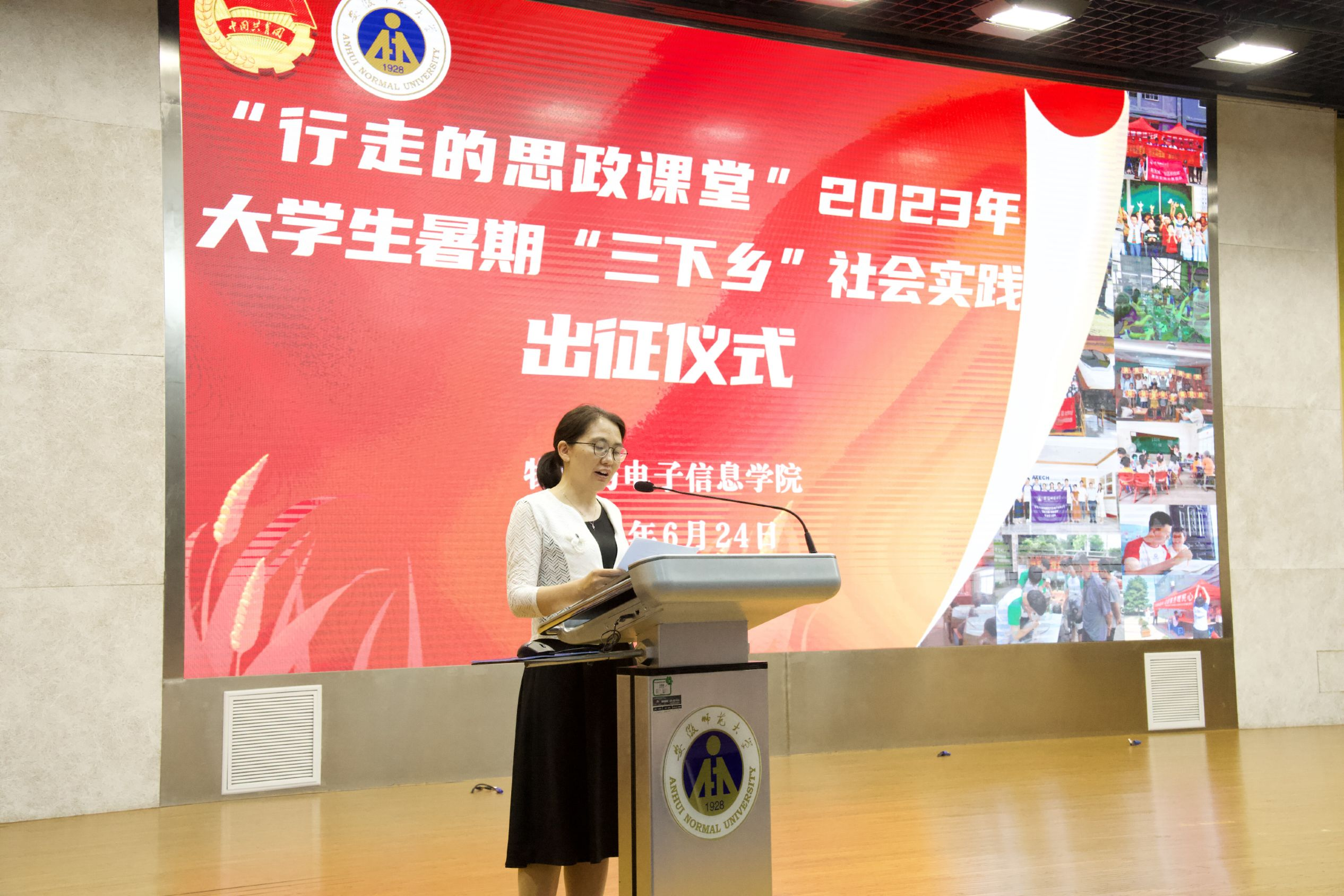6月24日下午,必赢线路检测3003no1在理化大楼报告厅举办“行走的思政课堂”2023年大学生暑期“三下乡”社会实践出征仪式。校团委副书记张虹,思想政治指导教师、马克思主义学院张涛,学院党委书记李娟,院党委副书记黄友生,院副院长张爱清,暑期社会实践指导教师代表、全体辅导员及社会实践团队代表参加仪式,仪式由院团委书记刘冠琪老师主持。