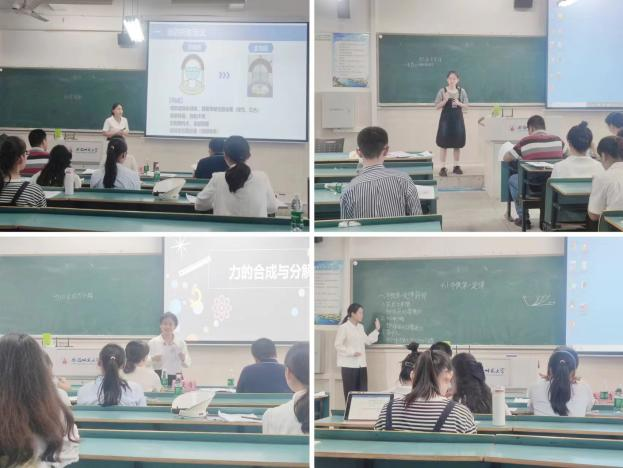 在模拟授课环节,参赛选手选择高中物理加速度、摩擦力、光的折射、超重与失重、动量定理等课题,进行了精彩的模拟课堂教学。精美的课件、工整的板书、大方自然的教态、抑扬顿挫的语调、生动有趣的课堂演示实验,充分展现出选手们扎实的教学基本功以及逻辑严谨的物理教学思维。