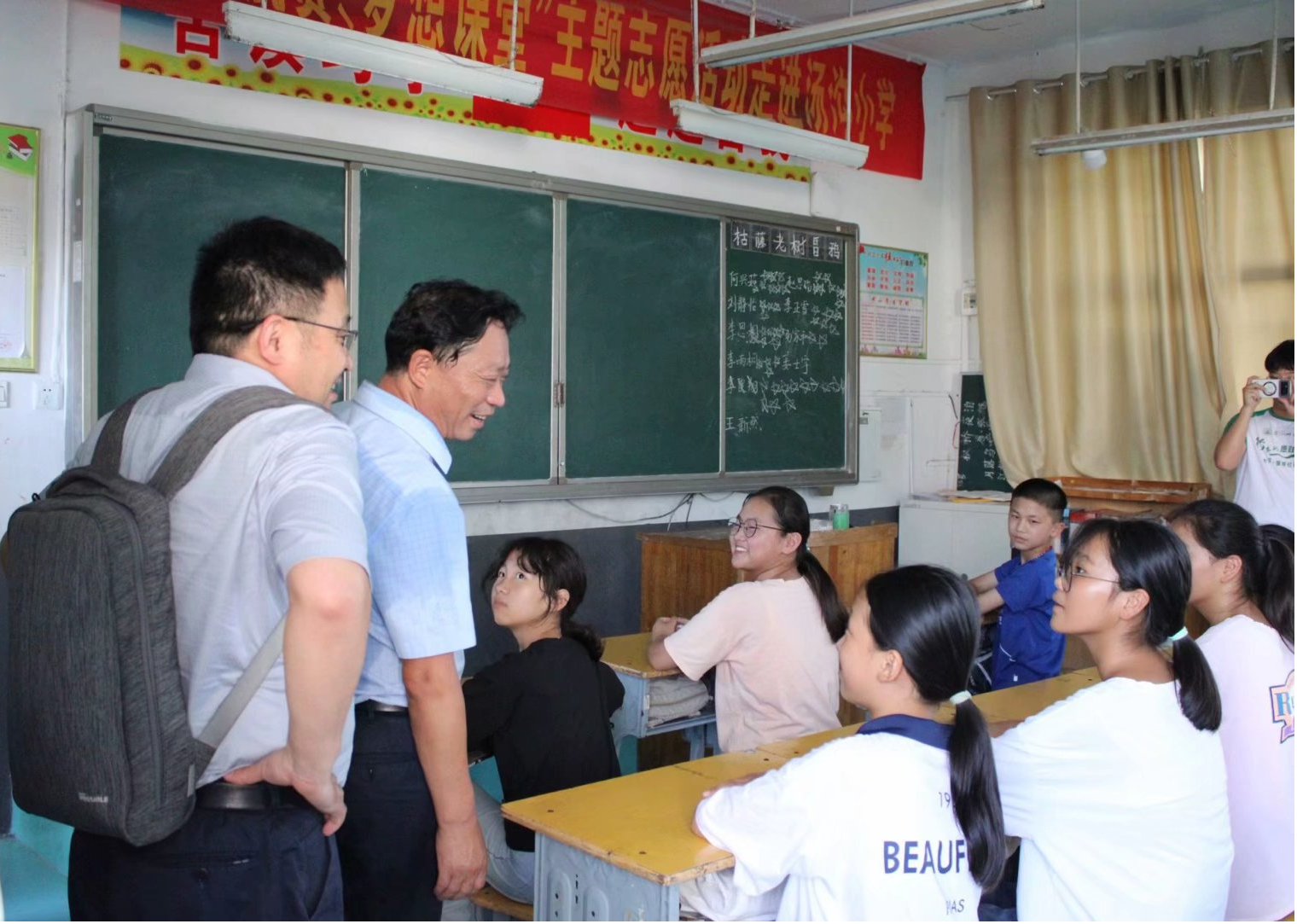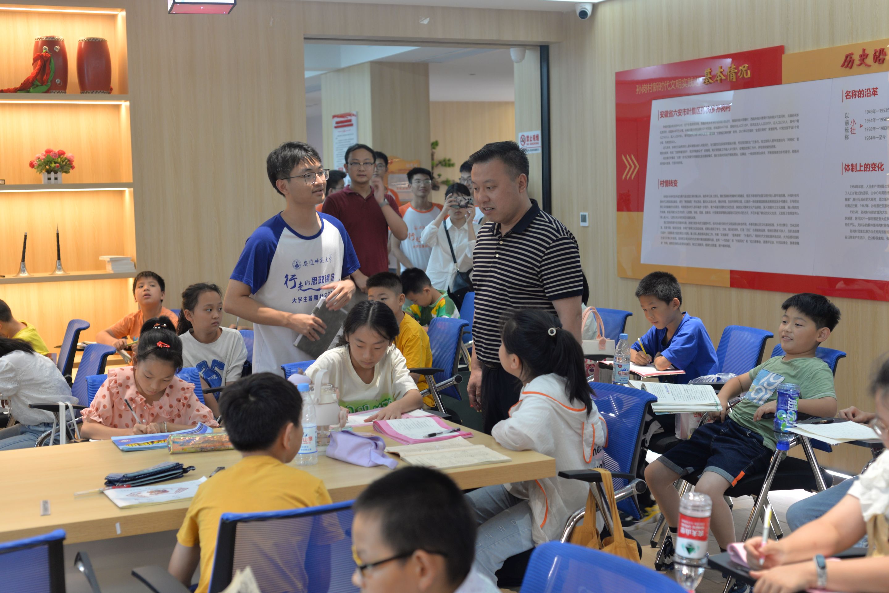 在六安孙岗村文明实践站,院党委副书记黄友生一行参观了小学部、初中部的教学开展情况,同时听取了一堂物理教学课他对团队的课程种类安排表示高度赞许,对团队成员的成长感到十分欣慰,他强调,暑期社会实践是大学生开阔视野的窗口和提升个人专业素质的重要途径,希望支教队员能够认真对待本次实践活动,在实践期间注重言行举止,树立师大人的榜样模范形象。