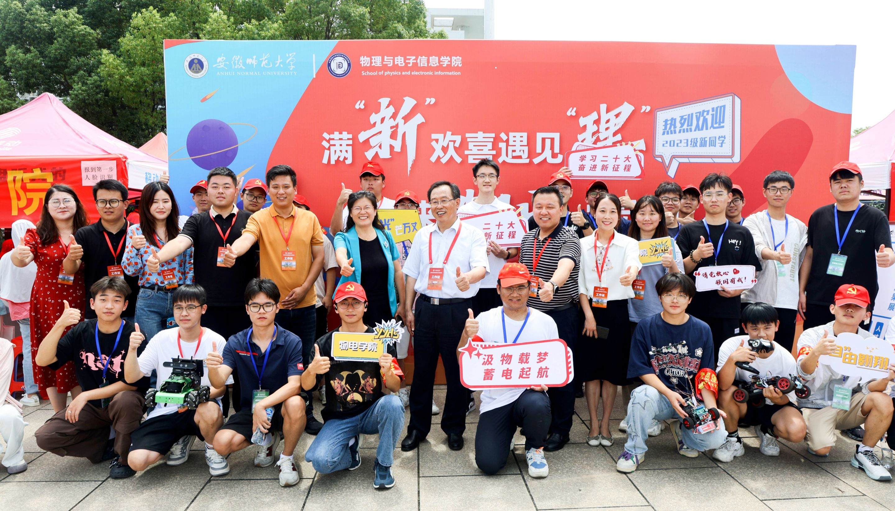 迎新现场,一列展台上展示着物电学子制作的科技作品,从工科学生研制能歌善舞的机器人、风驰电掣的智能汽车到物理师范生自制的磁感应强度探究仪、法拉第电磁感应定律演示仪、共振现象演示仪等物理教具,通过学生志愿者专业演示与讲解,让新生们在展览中感受学科魅力,对自己专业有了进一步认识。此外,学院学团组织简介、育人品牌项目、2023届考研光荣榜等宣传内容也在潜移默化中让专业思想教育加深加固。