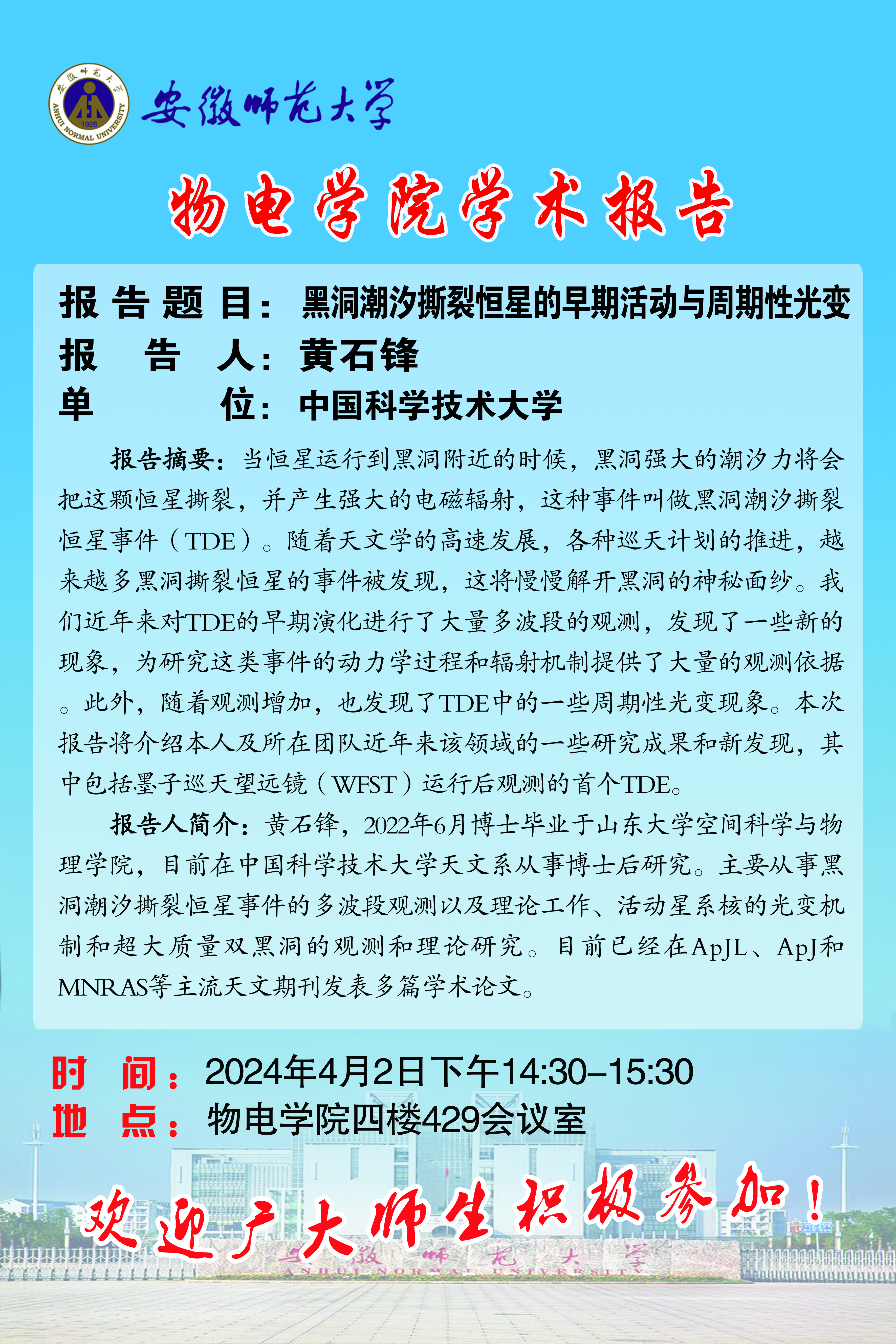 【学术预告】物电讲坛第9期:黑洞潮汐撕裂恒星的早期活动与周期性光变
