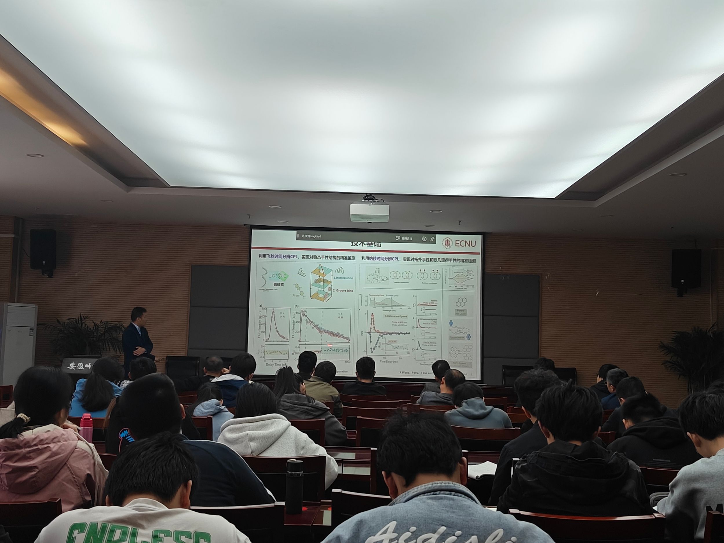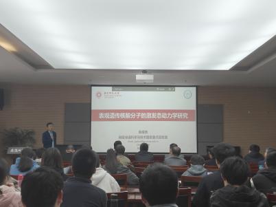 报告会上,陈缙泉教授首先简要介绍了核酸分子的研究背景及意义。核酸是地球上绝大多数生命体的遗传信息载体。研究表明,核酸分子中存在着多种动态表观遗传修饰,这些修饰不仅改变核酸的分子结构,还在基因表达、生长发育、生理功能调控、癌症发病等生理过程中起着重要的作用。其中,甲基化修饰是最主要的核酸表观遗传修饰。已有报道表明,核酸甲基化修饰的程度会显著影响其光化学损伤及修复,但是该过程的微观化学反应机理还未明确。陈缙泉教授结合课题组的研究进展,同与会师生分享了采用时间分辨光谱技术,自下而上地对一系列表观遗传的核酸碱基、二聚体、DNA链的激发态动力学进行的系统研究。在报告中,陈缙泉教授总结了表观遗传修饰对核酸碱基激发态特性的影响规律,并深入讨论了表观遗传修饰碱基对DNA中的电子转移、能量转移以及进一步的DNA光损伤机制的影响,展示了该工作在后续开展核酸动态化学修饰精确调控以及开发相关光动力学疗法药物等方面的应用前景。报告会结束后,与会师生和陈缙泉教授就相关问题展开了热烈的讨论和交流。