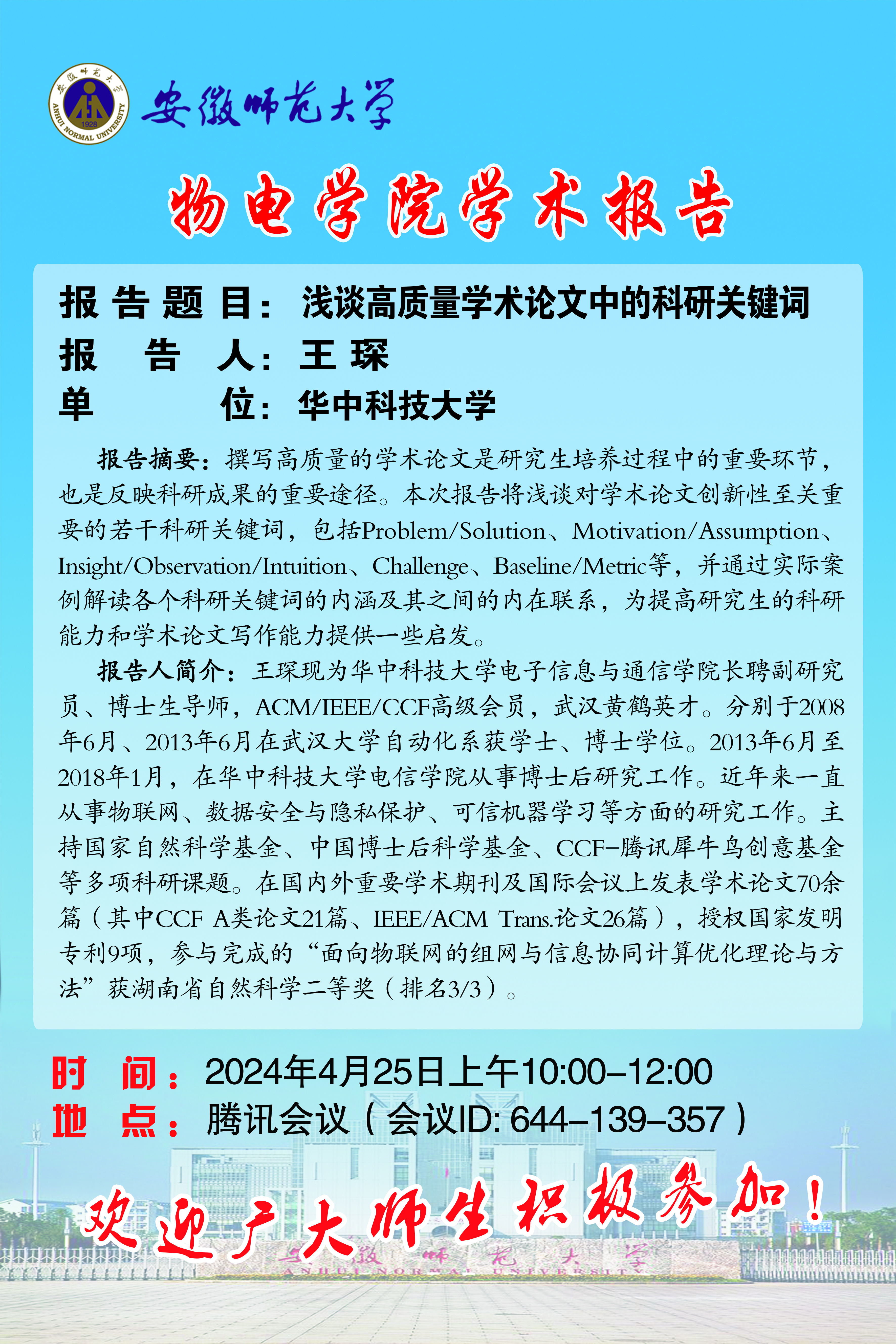 地址:花津校区-安徽省芜湖市九华南路189号 邮编:241000 电话:0553--3869894