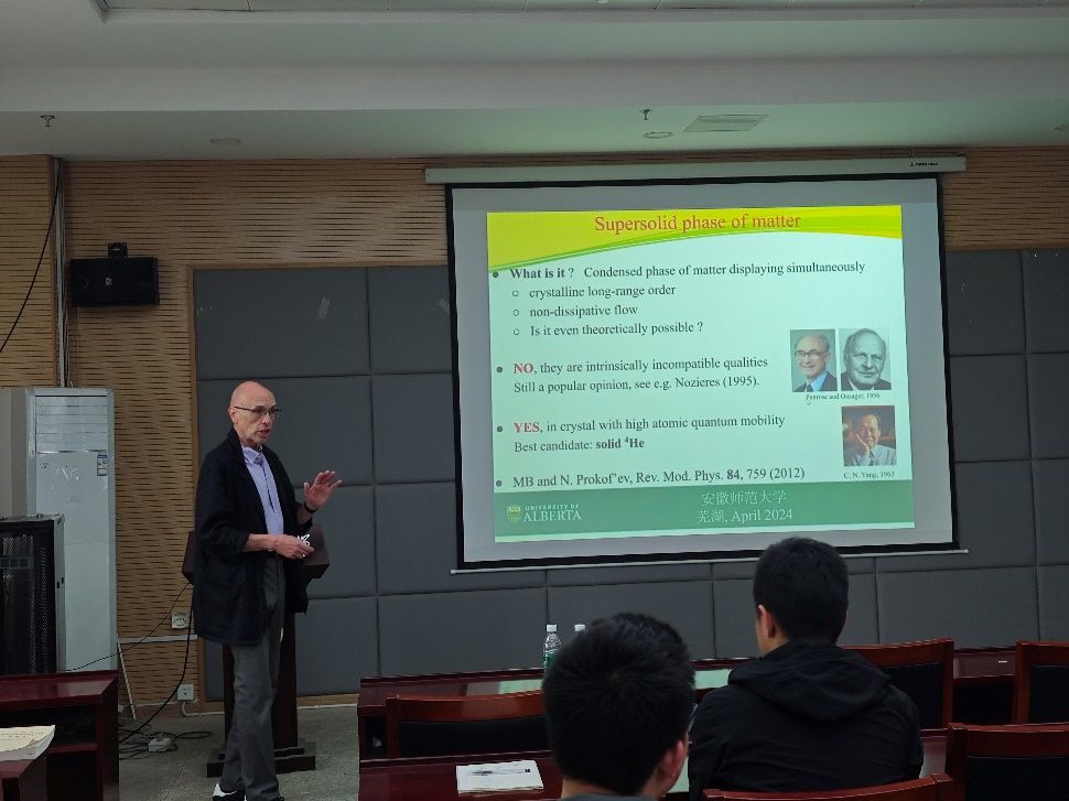 报告会上, Massimo Boninsegni教授首先探讨了固体氦-4被认为是观察“超固态”相的有望候选者的看法,但是现在已经确认超固态在该物理系统中并不存在。接着,Massimo Boninsegni教授将话题转向了具有有限电或磁偶极矩的玻色子,近年来这些系统在实验上得到了广泛的研究。偶极相互作用的长程性和各向异性的特征为新型物质相打下了基础,其中包括超固态。最后,Massimo Boninsegni教授重点回顾了其小组关于玻色子相图的第一性原理的研究结果,并特别强调与实验观察直接相关的方面。报告会结束后,与会师生和Massimo Boninsegni教授就相关问题展开了热烈的讨论和交流。