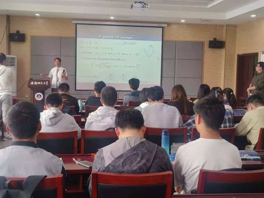 报告会上, 蔡子教授首先介绍了量子多体系统基态中的量子临界点也可以控制系统在远离平衡态时的普适动力学行为,这种行为可以通过系统量子几何的演化来捕捉。通过研究各种二次费米子模型中的量子淬火动力学,发现这些系统的量子体积通常会随时间线性增长,并且增长速度展示了普适的行为:其关于控制参数的一阶导数在量子临界点处表现出不连续性,具有一个普适的跳跃值,这个值不依赖于具体的模型,但主要由系统维度决定。这一结果揭示了非平衡量子多体系统的普适动力学性质。该研究揭示了量子多体系统在远离平衡态时,其动力学行为仍然受基态中的量子临界点的控制。这种控制体现在系统量子体积的线性增长上,并且增长的速度在量子临界点处会有特定的变化。这种变化是普适的,不依赖于具体的模型,但依赖于系统的维度。这为理解非平衡量子多体系统的动力学行为提供了新的视角和工具。