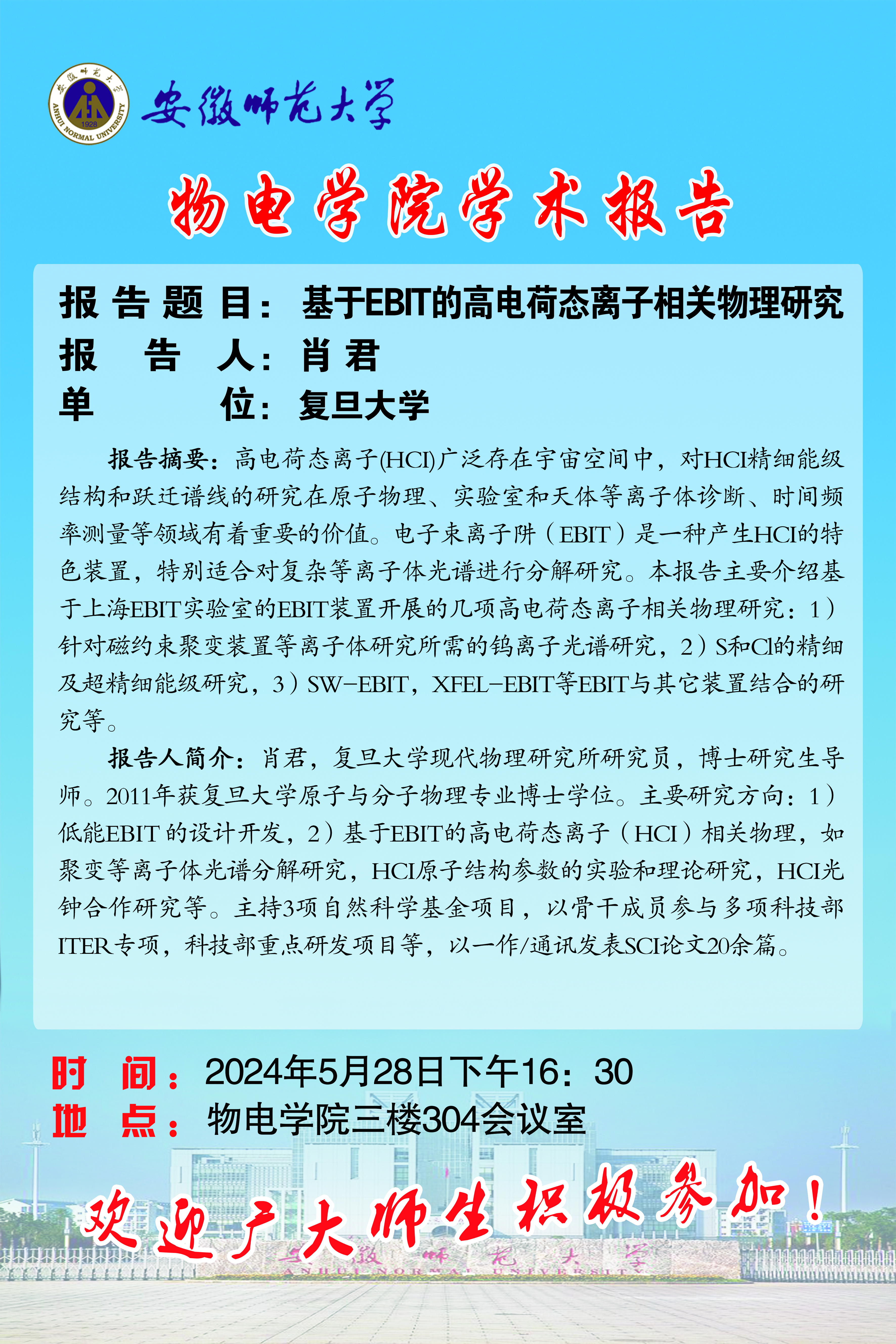 【学术预告】物电讲坛第31期:基于EBIT的高电荷态离子相关物理研究