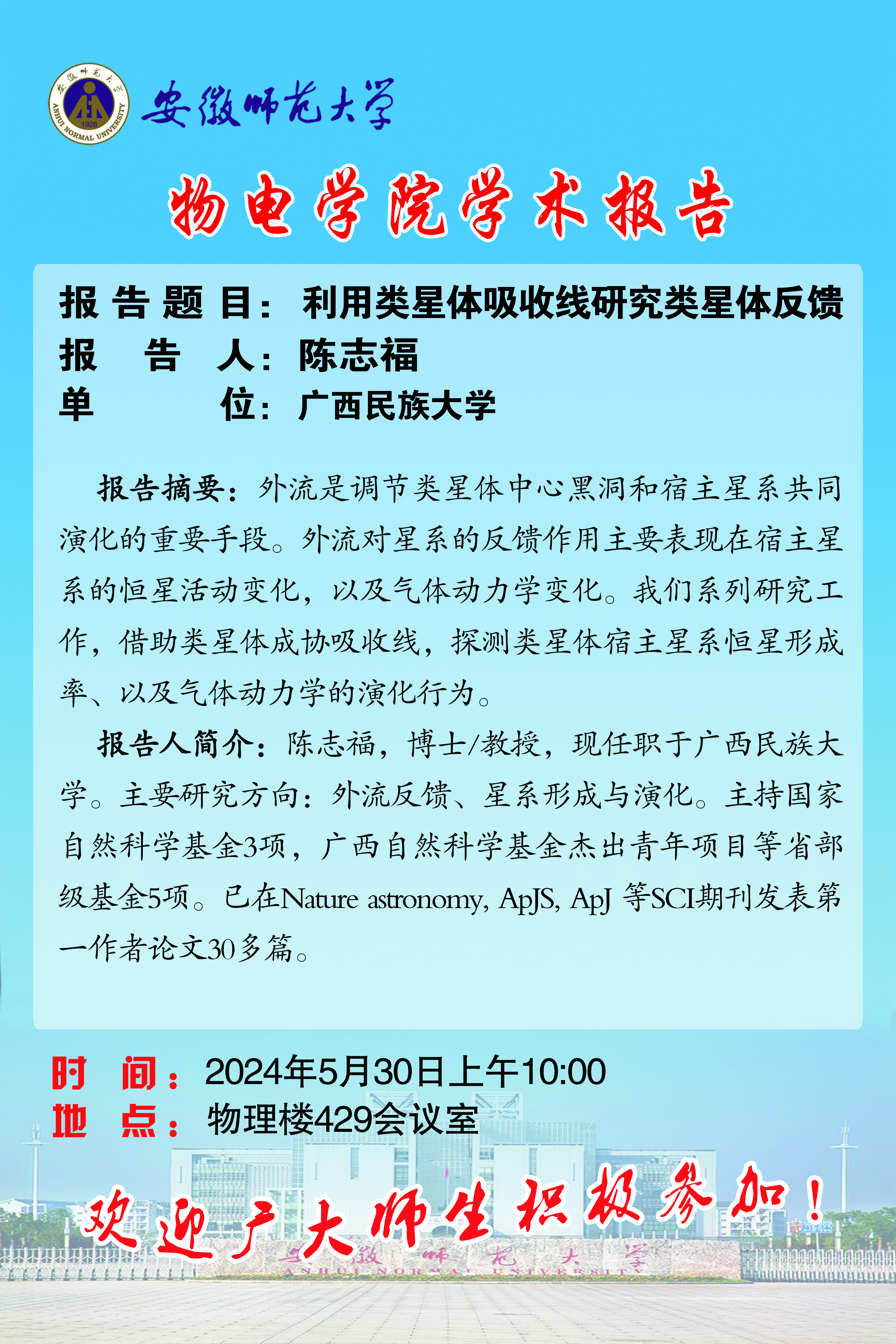 【学术预告】物电讲坛第33期:利用类星体吸收线研究类星体反馈