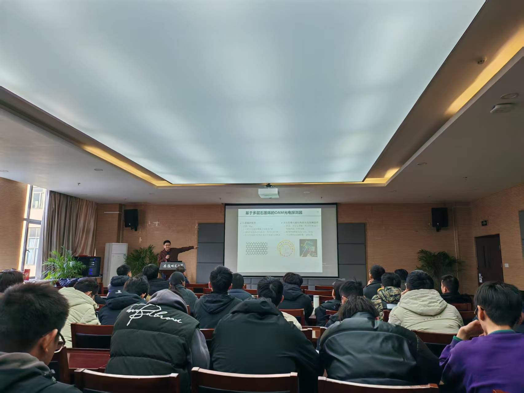 报告会上,孙栋教授首先介绍了对轨道角动量进行直接测量的重要意义,指出目前国际上基于拓扑外尔半金属WTe2所构筑的光轨道角动量直接电读技术尚存在一系列缺点:检测波段限于近红外区,并且响应速度在分钟量级。随后,孙栋教授详细介绍了他所领导的课题组在该领域的研究进展,指出可以基于第二类Weyl半金属TaIrTe4设计具有特殊电极结构的光电探测器,通过轨道光电流效应实现OAM拓扑荷的直接探测。进一步,基于多层石墨烯制备的光电探测器在中红外波段也实现了OAM的直接探测。由于石墨烯易于晶圆级外延生长,使其更适合于OAM直接光电探测器的大规模集成应用。基于高分辨能力的石墨烯OAM探测器,孙栋教授课题组进一步使用光弹调制器提升圆偏调制速度,成功地将探测器的响应速度大幅提升到毫秒量级,目前已经可以满足很多典型应用需求。报告结束后,与会师生与孙栋教授就该领域的相关科学问题与广阔应用前景进行了热烈的讨论和交流。